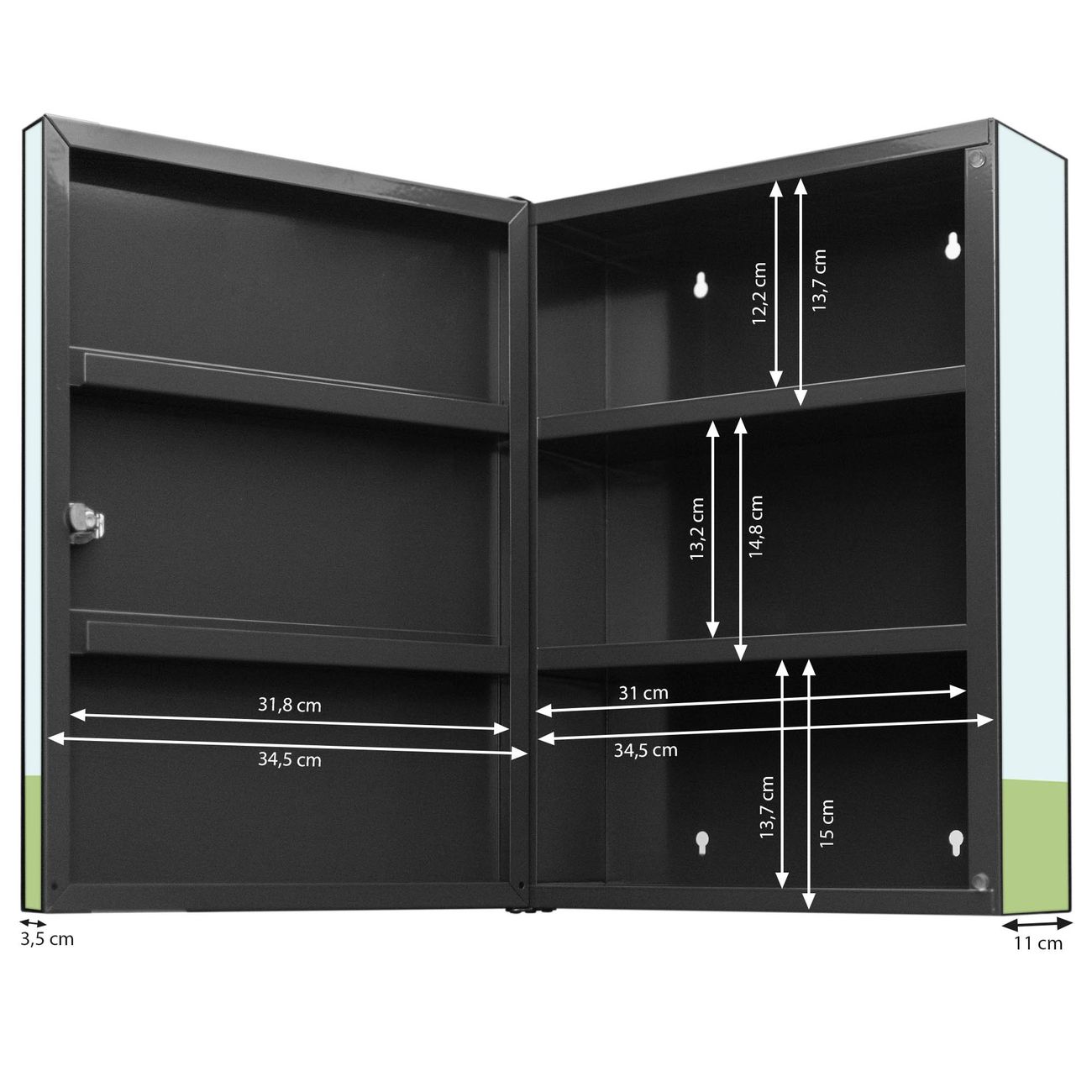Der Medizinschrank ist gesamt 35x46x15cm groß und wiegt ca. 3900g. Der Türanschlag ist links und kann nicht verändert werden, die Fronttür öffnet ca. 115°. Die Folierung befindet sich auf der Front und den Seiten. Das Gehäuse ist zeitlos anthrazit und aus Stahl gefertigt. Die innenliegenden Fächer haben verschiedene Größen für unterschiedliche Aufbewahrungsmöglichkeiten, in der Innentür können ebenfalls Dinge abgelegt werden. Befestigt wird der Medizinschrank an 4 Stellen auf der Rückseite, Sie erhalten 3 Schlüssel.