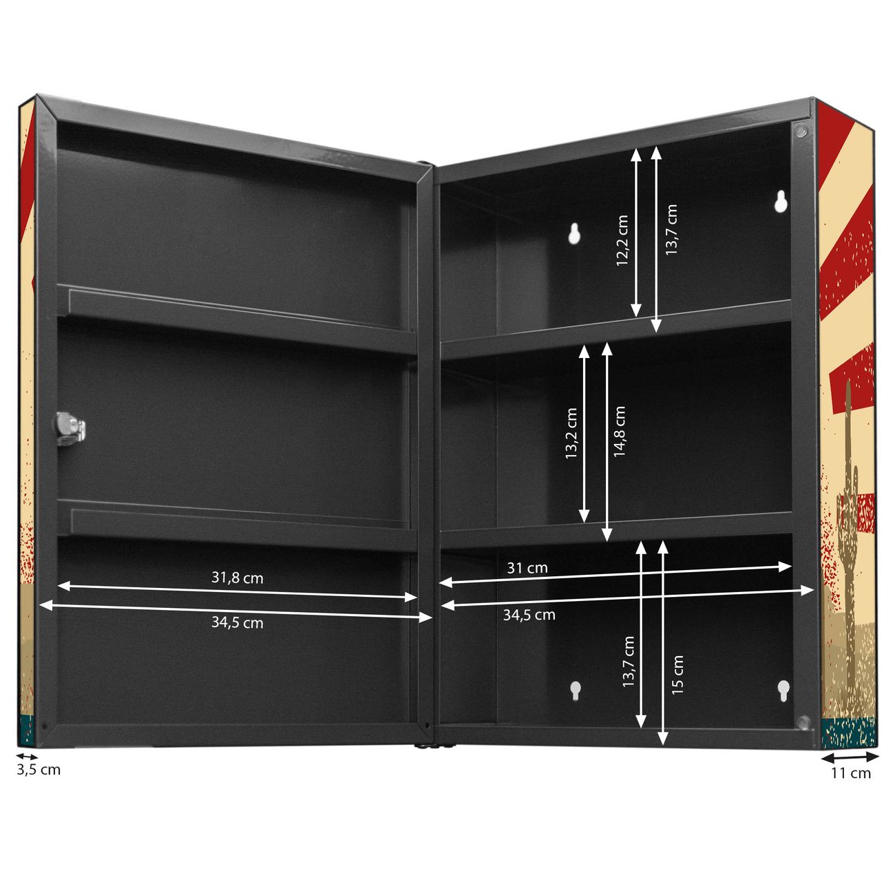 Der Medizinschrank ist gesamt 35x46x15cm groß und wiegt ca. 3900g. Der Türanschlag ist links und kann nicht verändert werden, die Fronttür öffnet ca. 115°. Die Folierung befindet sich auf der Front und den Seiten. Das Gehäuse ist zeitlos anthrazit und aus Stahl gefertigt. Die innenliegenden Fächer haben verschiedene Größen für unterschiedliche Aufbewahrungsmöglichkeiten, in der Innentür können ebenfalls Dinge abgelegt werden. Befestigt wird der Medizinschrank an 4 Stellen auf der Rückseite, Sie erhalten 3 Schlüssel.