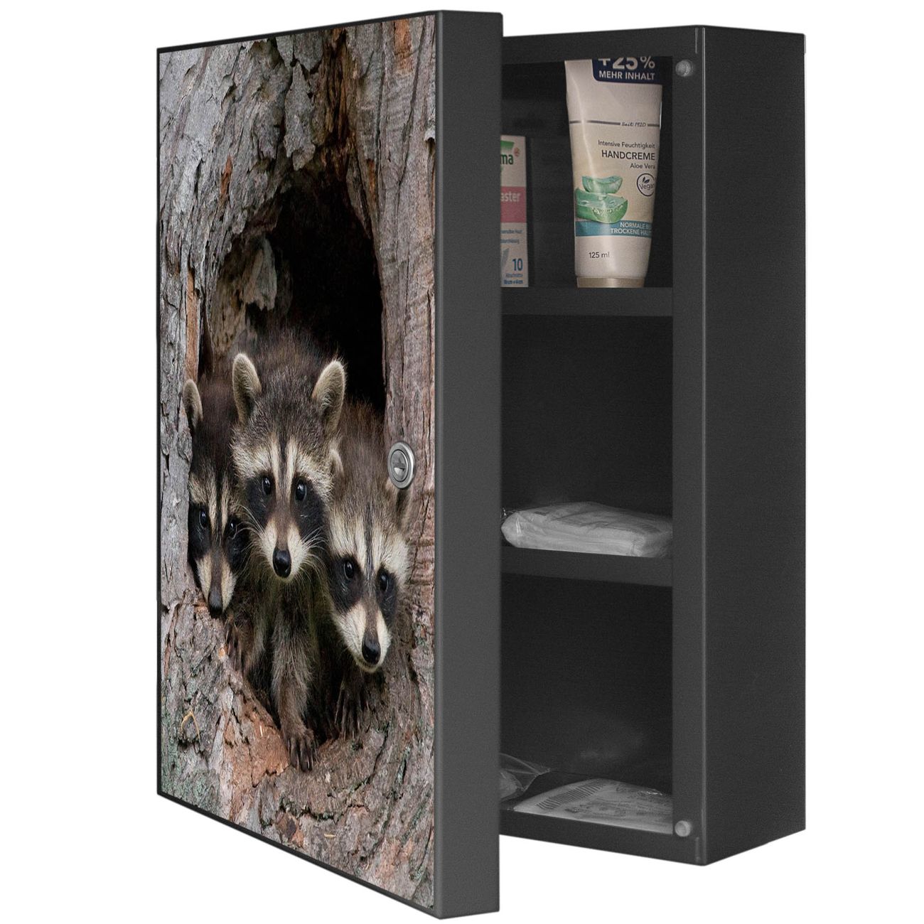 Medizinschrank Stahl Motiv Drei Waschbären