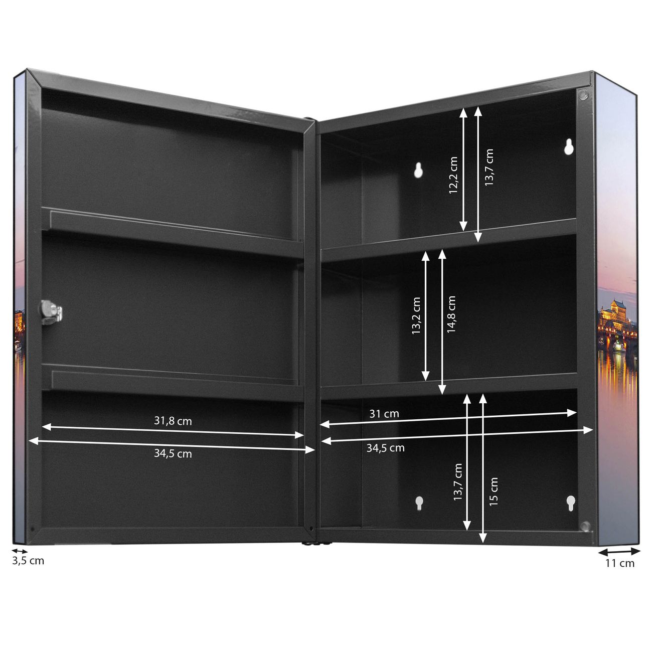 Der Medizinschrank ist gesamt 35x46x15cm groß und wiegt ca. 3900g. Der Türanschlag ist links und kann nicht verändert werden, die Fronttür öffnet ca. 115°. Die Folierung befindet sich auf der Front und den Seiten. Das Gehäuse ist zeitlos anthrazit und aus Stahl gefertigt. Die innenliegenden Fächer haben verschiedene Größen für unterschiedliche Aufbewahrungsmöglichkeiten, in der Innentür können ebenfalls Dinge abgelegt werden. Befestigt wird der Medizinschrank an 4 Stellen auf der Rückseite, Sie erhalten 3 Schlüssel.
