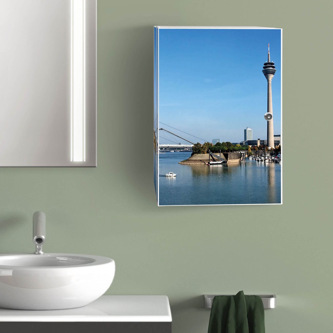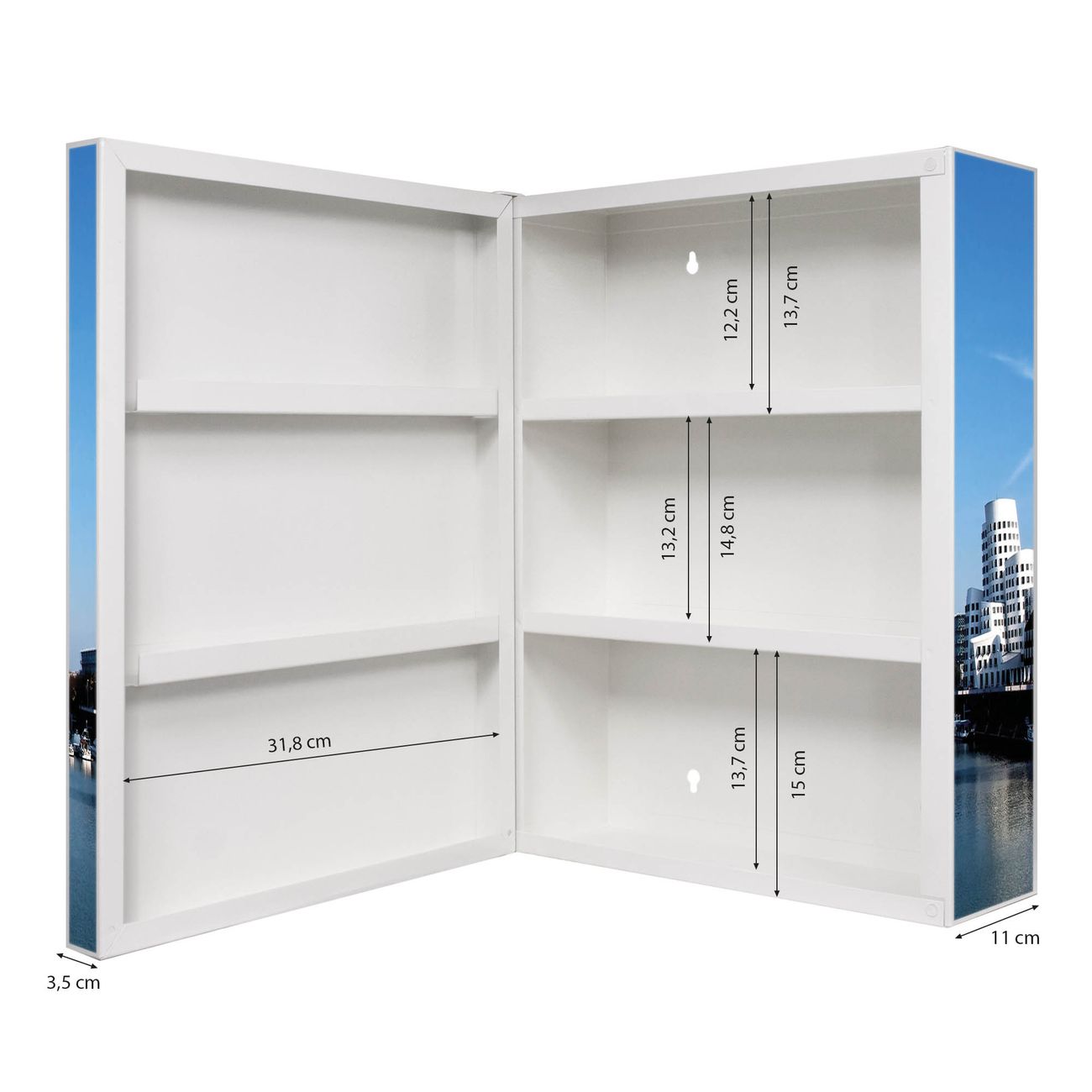 Der Medizinschrank ist gesamt 35x46x15cm groß und wiegt ca. 3900g. Der Türanschlag ist links und kann nicht verändert werden, die Fronttür öffnet ca. 115°. Die Folierung befindet sich auf der Front und den Seiten. Das Gehäuse ist zeitlos weiß und aus Stahl gefertigt. Die innenliegenden Fächer haben verschiedene Größen für unterschiedliche Aufbewahrungsmöglichkeiten, in der Innentür können ebenfalls Dinge abgelegt werden. Befestigt wird der Medizinschrank an 4 Stellen auf der Rückseite, Sie erhalten 3 Schlüssel.
