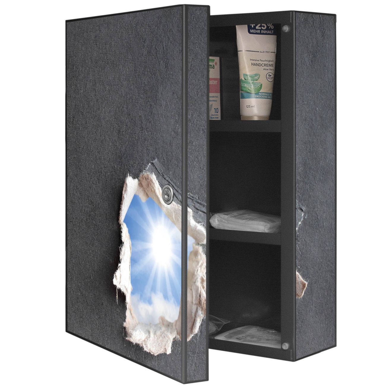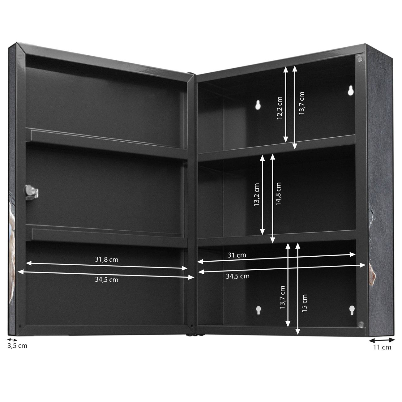 Der Medizinschrank ist gesamt 35x46x15cm groß und wiegt ca. 3900g. Der Türanschlag ist links und kann nicht verändert werden, die Fronttür öffnet ca. 115°. Die Folierung befindet sich auf der Front und den Seiten. Das Gehäuse ist zeitlos anthrazit und aus Stahl gefertigt. Die innenliegenden Fächer haben verschiedene Größen für unterschiedliche Aufbewahrungsmöglichkeiten, in der Innentür können ebenfalls Dinge abgelegt werden. Befestigt wird der Medizinschrank an 4 Stellen auf der Rückseite, Sie erhalten 3 Schlüssel.