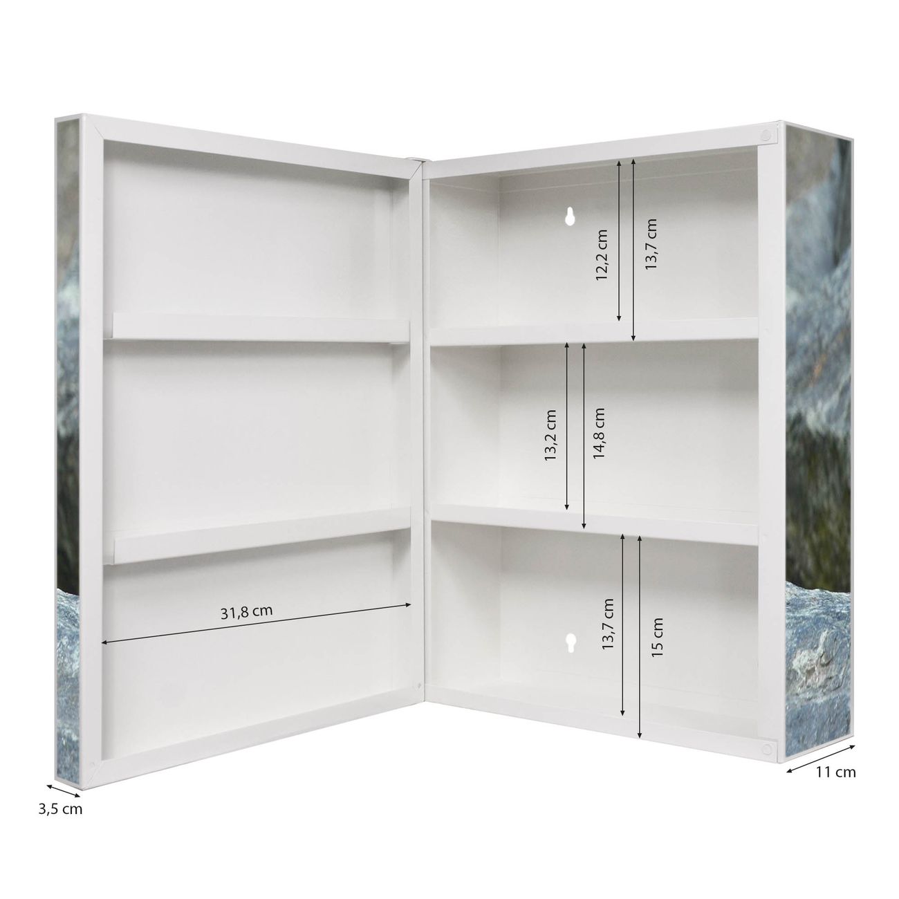 Der Medizinschrank ist gesamt 35x46x15cm groß und wiegt ca. 3900g. Der Türanschlag ist links und kann nicht verändert werden, die Fronttür öffnet ca. 115°. Die Folierung befindet sich auf der Front und den Seiten. Das Gehäuse ist zeitlos weiß und aus Stahl gefertigt. Die innenliegenden Fächer haben verschiedene Größen für unterschiedliche Aufbewahrungsmöglichkeiten, in der Innentür können ebenfalls Dinge abgelegt werden. Befestigt wird der Medizinschrank an 4 Stellen auf der Rückseite, Sie erhalten 3 Schlüssel.