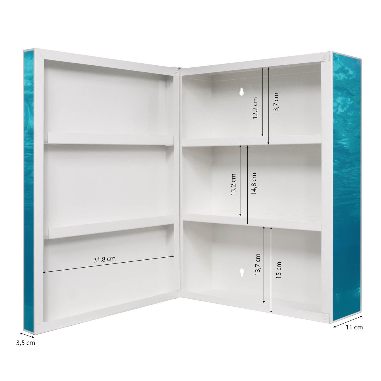 Der Medizinschrank ist gesamt 35x46x15cm groß und wiegt ca. 3900g. Der Türanschlag ist links und kann nicht verändert werden, die Fronttür öffnet ca. 115°. Die Folierung befindet sich auf der Front und den Seiten. Das Gehäuse ist zeitlos weiß und aus Stahl gefertigt. Die innenliegenden Fächer haben verschiedene Größen für unterschiedliche Aufbewahrungsmöglichkeiten, in der Innentür können ebenfalls Dinge abgelegt werden. Befestigt wird der Medizinschrank an 4 Stellen auf der Rückseite, Sie erhalten 3 Schlüssel.
