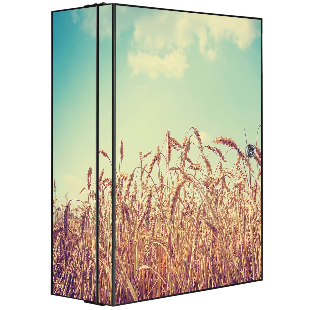 Der Medizinschrank ist gesamt 35x46x15cm groß und wiegt ca. 3900g. Der Türanschlag ist links und kann nicht verändert werden, die Fronttür öffnet ca. 115°. Die Folierung befindet sich auf der Front und den Seiten. Das Gehäuse ist zeitlos anthrazit und aus Stahl gefertigt. Die innenliegenden Fächer haben verschiedene Größen für unterschiedliche Aufbewahrungsmöglichkeiten, in der Innentür können ebenfalls Dinge abgelegt werden. Befestigt wird der Medizinschrank an 4 Stellen auf der Rückseite, Sie erhalten 3 Schlüssel.