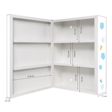 Der Medizinschrank ist gesamt 35x46x15cm groß und wiegt ca. 3900g. Der Türanschlag ist links und kann nicht verändert werden, die Fronttür öffnet ca. 115°. Die Folierung befindet sich auf der Front und den Seiten. Das Gehäuse ist zeitlos weiß und aus Stahl gefertigt. Die innenliegenden Fächer haben verschiedene Größen für unterschiedliche Aufbewahrungsmöglichkeiten, in der Innentür können ebenfalls Dinge abgelegt werden. Befestigt wird der Medizinschrank an 4 Stellen auf der Rückseite, Sie erhalten 3 Schlüssel.