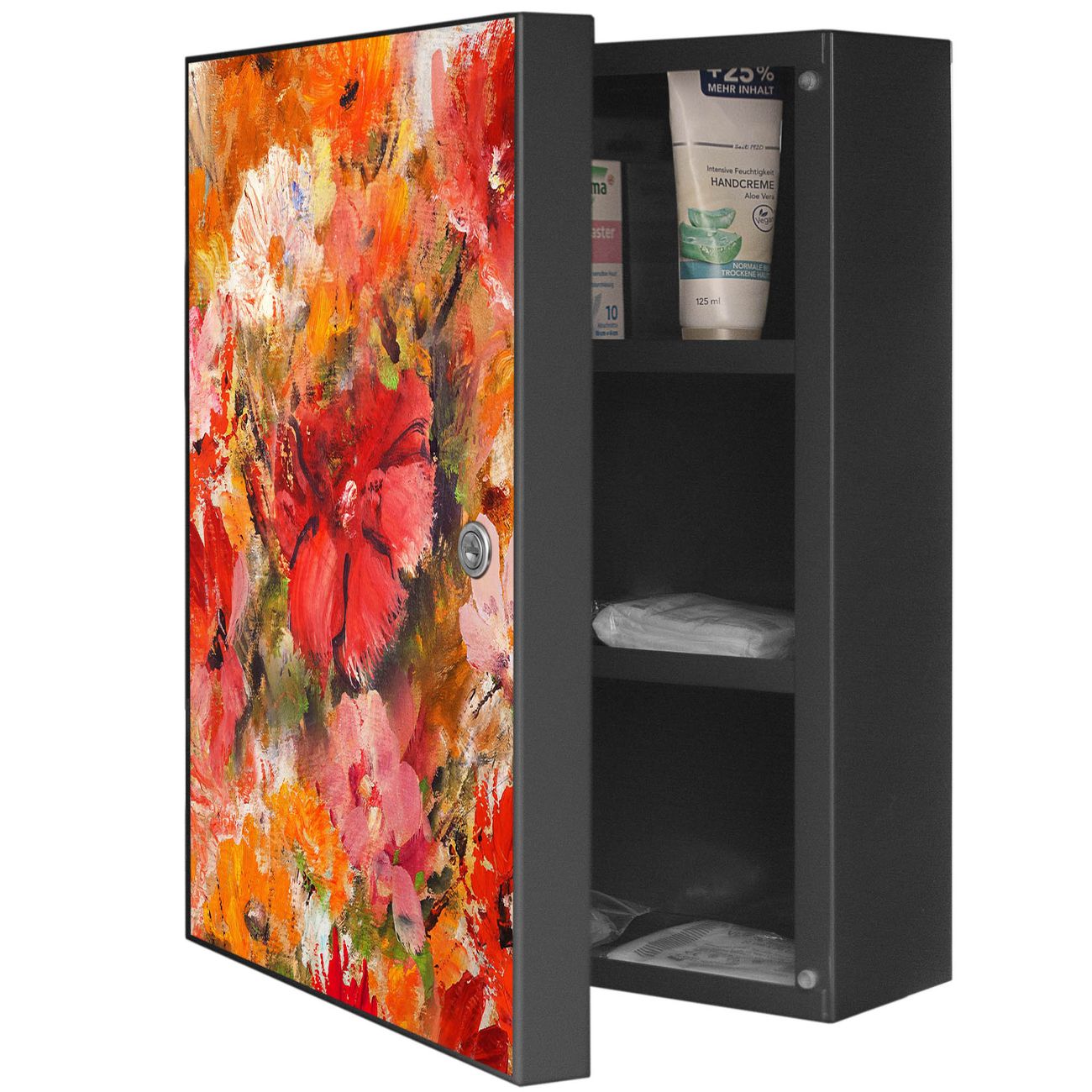 Der Medizinschrank ist gesamt 35x46x15cm groß und wiegt ca. 3900g. Der Türanschlag ist links und kann nicht verändert werden, die Fronttür öffnet ca. 115°. Die Folierung befindet sich auf der Front. Das Gehäuse ist zeitlos anthrazit und aus Stahl gefertigt. Die innenliegenden Fächer haben verschiedene Größen für unterschiedliche Aufbewahrungsmöglichkeiten, in der Innentür können ebenfalls Dinge abgelegt werden. Befestigt wird der Medizinschrank an 4 Stellen auf der Rückseite, Sie erhalten 3 Schlüssel.