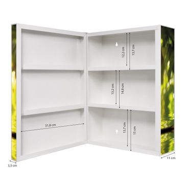 Der Medizinschrank ist gesamt 35x46x15cm groß und wiegt ca. 3900g. Der Türanschlag ist links und kann nicht verändert werden, die Fronttür öffnet ca. 115°. Die Folierung befindet sich auf der Front und den Seiten. Das Gehäuse ist zeitlos weiß und aus Stahl gefertigt. Die innenliegenden Fächer haben verschiedene Größen für unterschiedliche Aufbewahrungsmöglichkeiten, in der Innentür können ebenfalls Dinge abgelegt werden. Befestigt wird der Medizinschrank an 4 Stellen auf der Rückseite, Sie erhalten 3 Schlüssel.