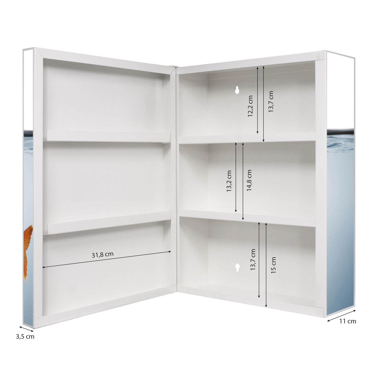Der Medizinschrank ist gesamt 35x46x15cm groß und wiegt ca. 3900g. Der Türanschlag ist links und kann nicht verändert werden, die Fronttür öffnet ca. 115°. Die Folierung befindet sich auf der Front und den Seiten. Das Gehäuse ist zeitlos weiß und aus Stahl gefertigt. Die innenliegenden Fächer haben verschiedene Größen für unterschiedliche Aufbewahrungsmöglichkeiten, in der Innentür können ebenfalls Dinge abgelegt werden. Befestigt wird der Medizinschrank an 4 Stellen auf der Rückseite, Sie erhalten 3 Schlüssel.