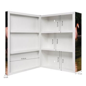 Der Medizinschrank ist gesamt 35x46x15cm groß und wiegt ca. 3900g. Der Türanschlag ist links und kann nicht verändert werden, die Fronttür öffnet ca. 115°. Die Folierung befindet sich auf der Front und den Seiten. Das Gehäuse ist zeitlos weiß und aus Stahl gefertigt. Die innenliegenden Fächer haben verschiedene Größen für unterschiedliche Aufbewahrungsmöglichkeiten, in der Innentür können ebenfalls Dinge abgelegt werden. Befestigt wird der Medizinschrank an 4 Stellen auf der Rückseite, Sie erhalten 3 Schlüssel.