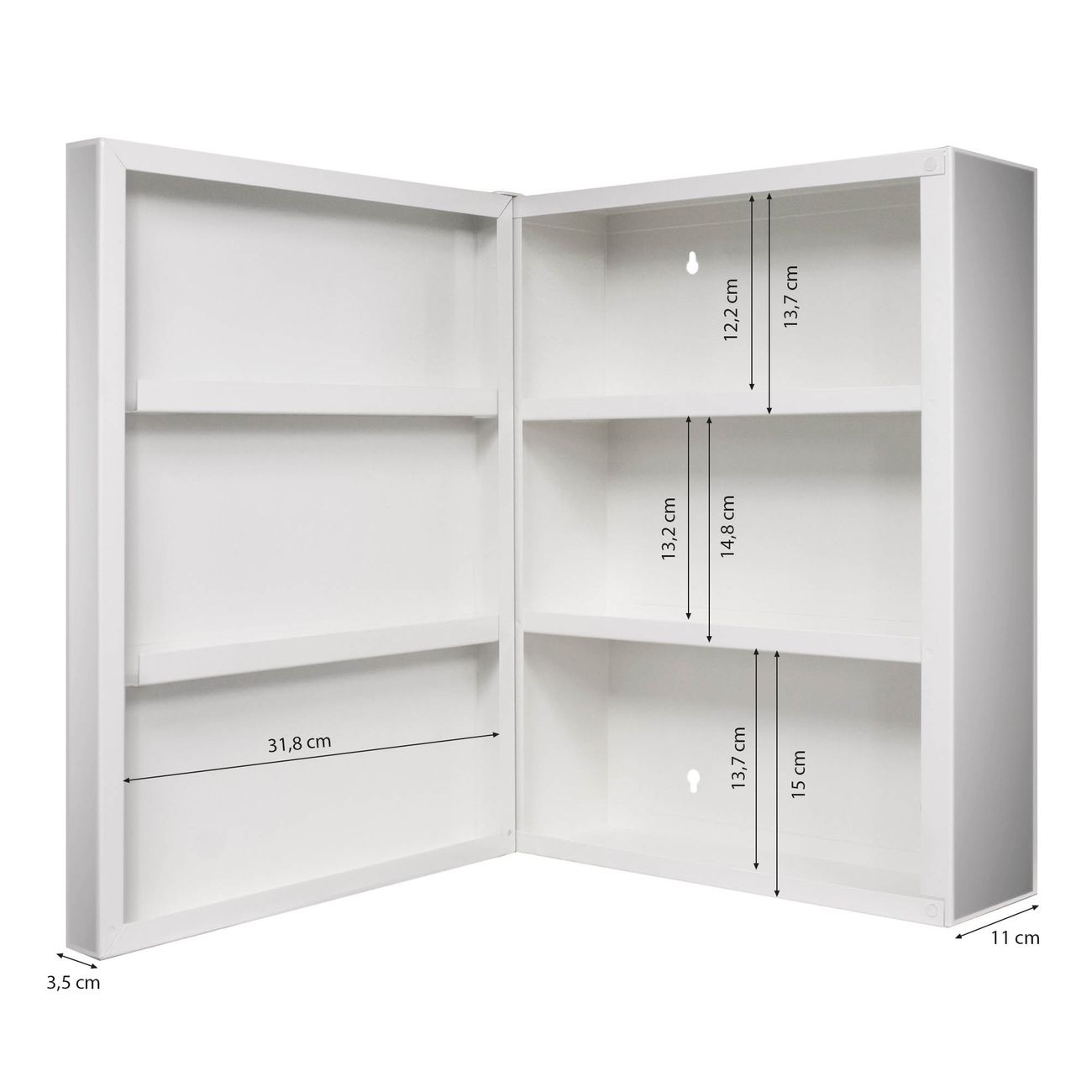 Der Medizinschrank ist gesamt 35x46x15cm groß und wiegt ca. 3900g. Der Türanschlag ist links und kann nicht verändert werden, die Fronttür öffnet ca. 115°. Die Folierung befindet sich auf der Front und den Seiten. Das Gehäuse ist zeitlos weiß und aus Stahl gefertigt. Die innenliegenden Fächer haben verschiedene Größen für unterschiedliche Aufbewahrungsmöglichkeiten, in der Innentür können ebenfalls Dinge abgelegt werden. Befestigt wird der Medizinschrank an 4 Stellen auf der Rückseite, Sie erhalten 3 Schlüssel.