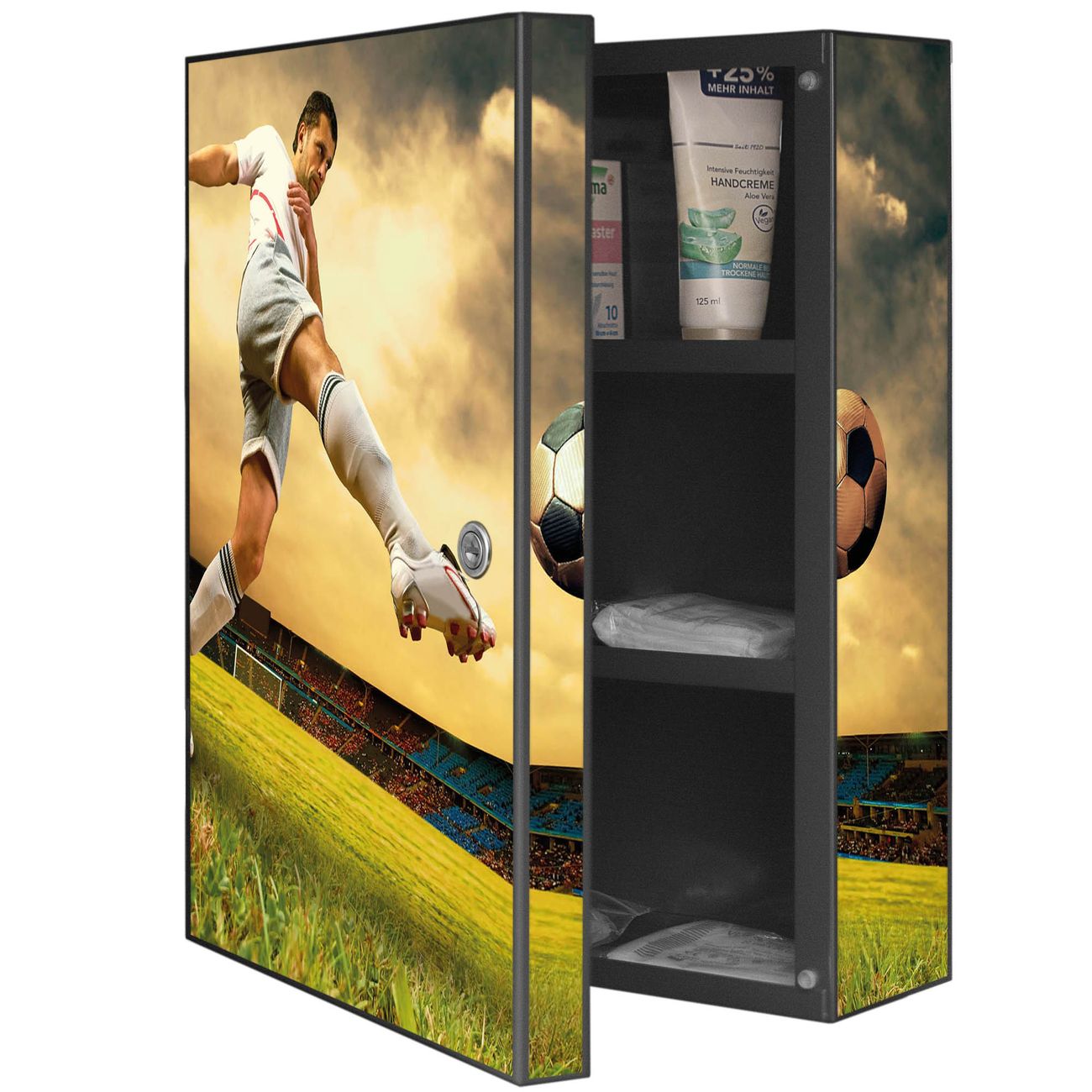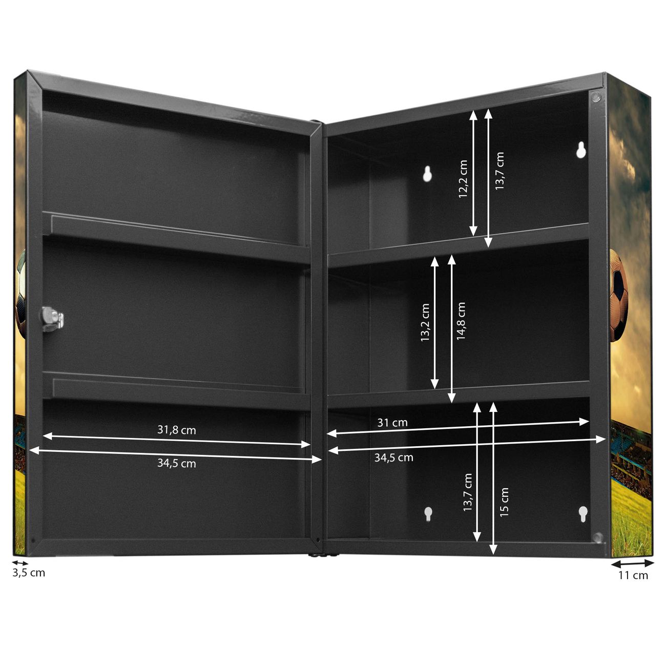 Der Medizinschrank ist gesamt 35x46x15cm groß und wiegt ca. 3900g. Der Türanschlag ist links und kann nicht verändert werden, die Fronttür öffnet ca. 115°. Die Folierung befindet sich auf der Front und den Seiten. Das Gehäuse ist zeitlos anthrazit und aus Stahl gefertigt. Die innenliegenden Fächer haben verschiedene Größen für unterschiedliche Aufbewahrungsmöglichkeiten, in der Innentür können ebenfalls Dinge abgelegt werden. Befestigt wird der Medizinschrank an 4 Stellen auf der Rückseite, Sie erhalten 3 Schlüssel.