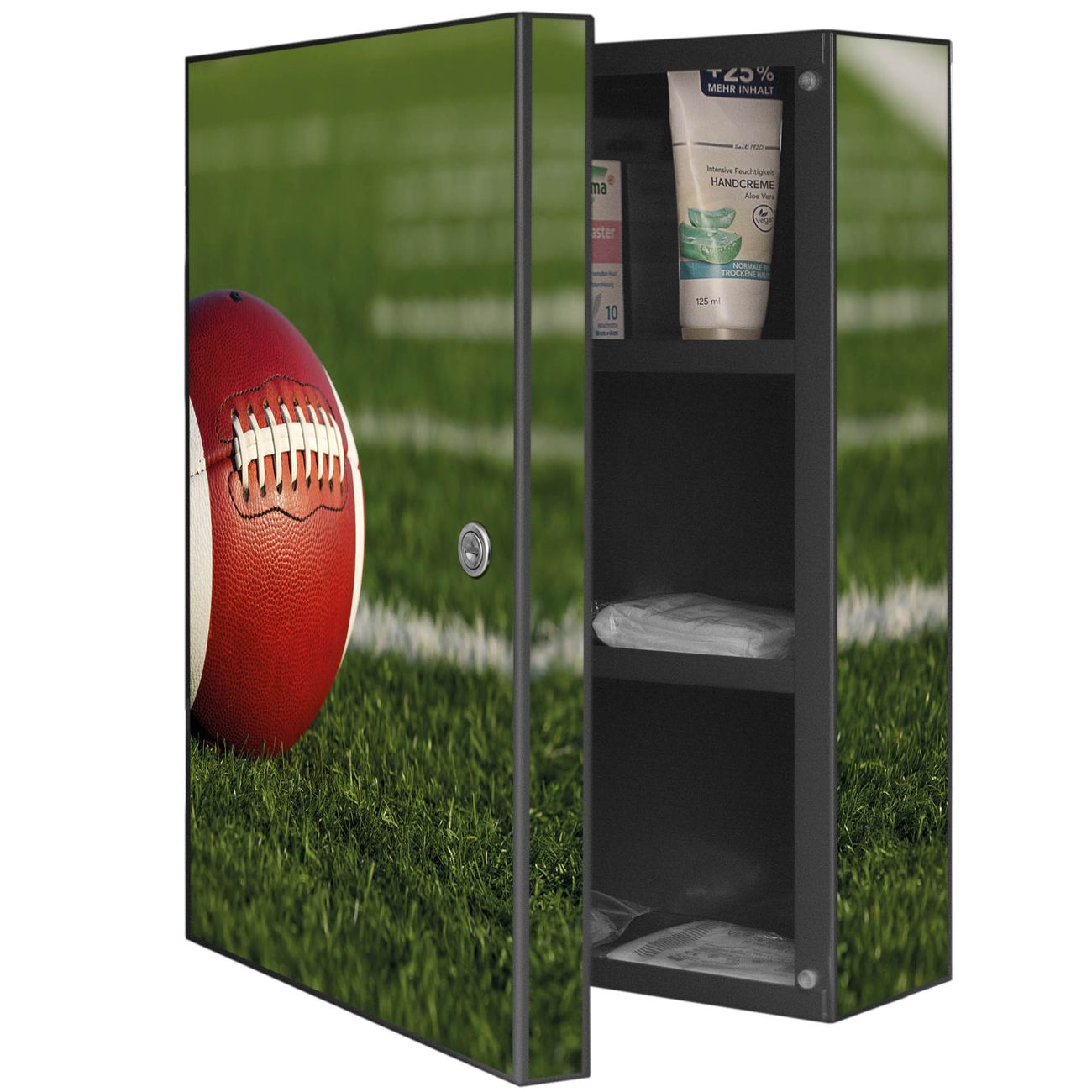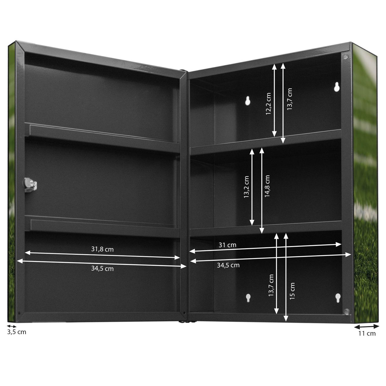 Der Medizinschrank ist gesamt 35x46x15cm groß und wiegt ca. 3900g. Der Türanschlag ist links und kann nicht verändert werden, die Fronttür öffnet ca. 115°. Die Folierung befindet sich auf der Front und den Seiten. Das Gehäuse ist zeitlos anthrazit und aus Stahl gefertigt. Die innenliegenden Fächer haben verschiedene Größen für unterschiedliche Aufbewahrungsmöglichkeiten, in der Innentür können ebenfalls Dinge abgelegt werden. Befestigt wird der Medizinschrank an 4 Stellen auf der Rückseite, Sie erhalten 3 Schlüssel.