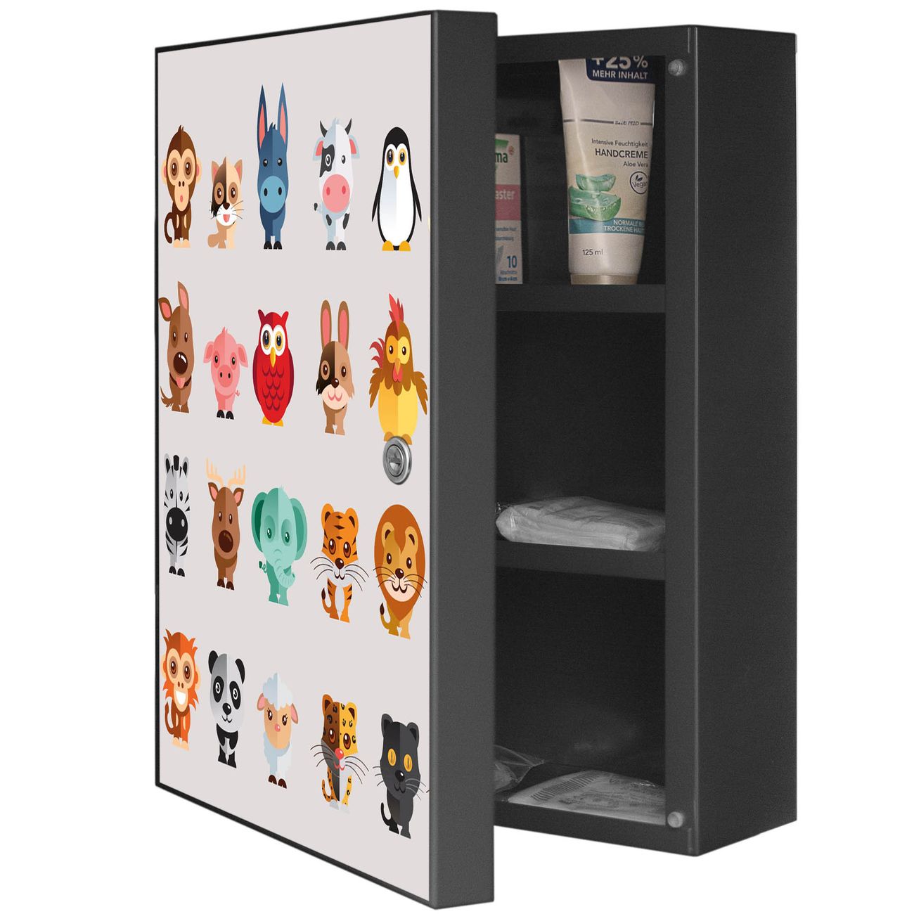 Der Medizinschrank ist gesamt 35x46x15cm groß und wiegt ca. 3900g. Der Türanschlag ist links und kann nicht verändert werden, die Fronttür öffnet ca. 115°. Die Folierung befindet sich auf der Front. Das Gehäuse ist zeitlos anthrazit und aus Stahl gefertigt. Die innenliegenden Fächer haben verschiedene Größen für unterschiedliche Aufbewahrungsmöglichkeiten, in der Innentür können ebenfalls Dinge abgelegt werden. Befestigt wird der Medizinschrank an 4 Stellen auf der Rückseite, Sie erhalten 3 Schlüssel.