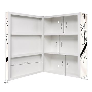 Der Medizinschrank ist gesamt 35x46x15cm groß und wiegt ca. 3900g. Der Türanschlag ist links und kann nicht verändert werden, die Fronttür öffnet ca. 115°. Die Folierung befindet sich auf der Front und den Seiten. Das Gehäuse ist zeitlos weiß und aus Stahl gefertigt. Die innenliegenden Fächer haben verschiedene Größen für unterschiedliche Aufbewahrungsmöglichkeiten, in der Innentür können ebenfalls Dinge abgelegt werden. Befestigt wird der Medizinschrank an 4 Stellen auf der Rückseite, Sie erhalten 3 Schlüssel.