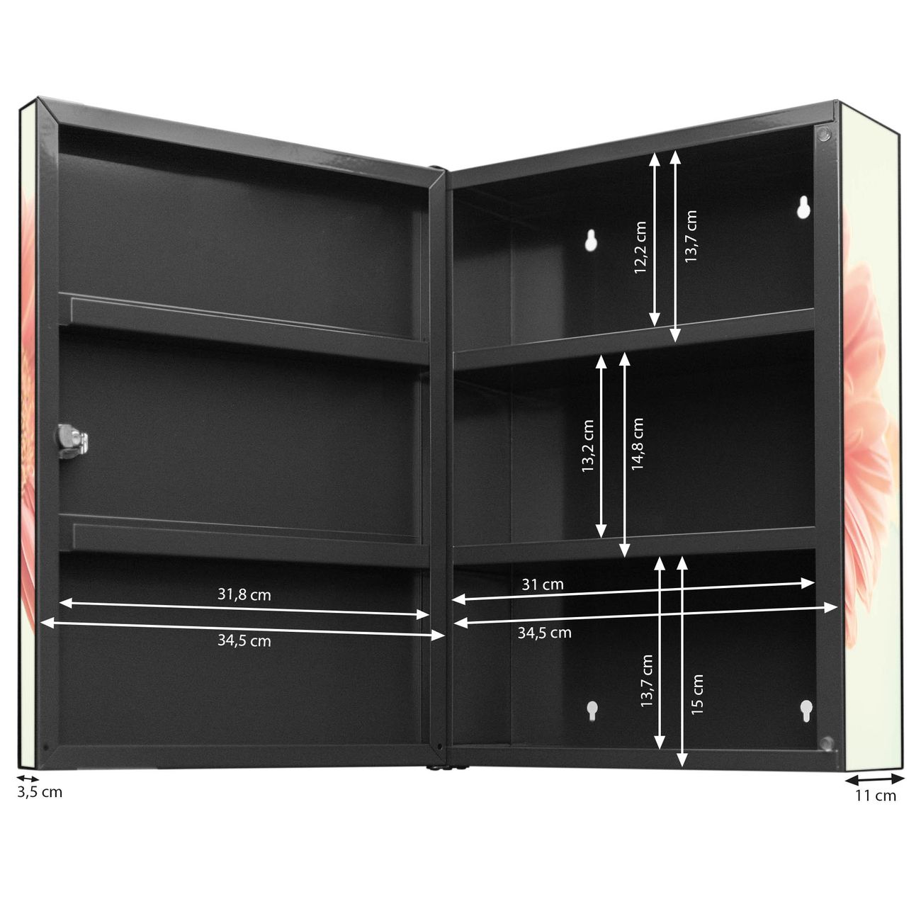 Der Medizinschrank ist gesamt 35x46x15cm groß und wiegt ca. 3900g. Der Türanschlag ist links und kann nicht verändert werden, die Fronttür öffnet ca. 115°. Die Folierung befindet sich auf der Front und den Seiten. Das Gehäuse ist zeitlos anthrazit und aus Stahl gefertigt. Die innenliegenden Fächer haben verschiedene Größen für unterschiedliche Aufbewahrungsmöglichkeiten, in der Innentür können ebenfalls Dinge abgelegt werden. Befestigt wird der Medizinschrank an 4 Stellen auf der Rückseite, Sie erhalten 3 Schlüssel.