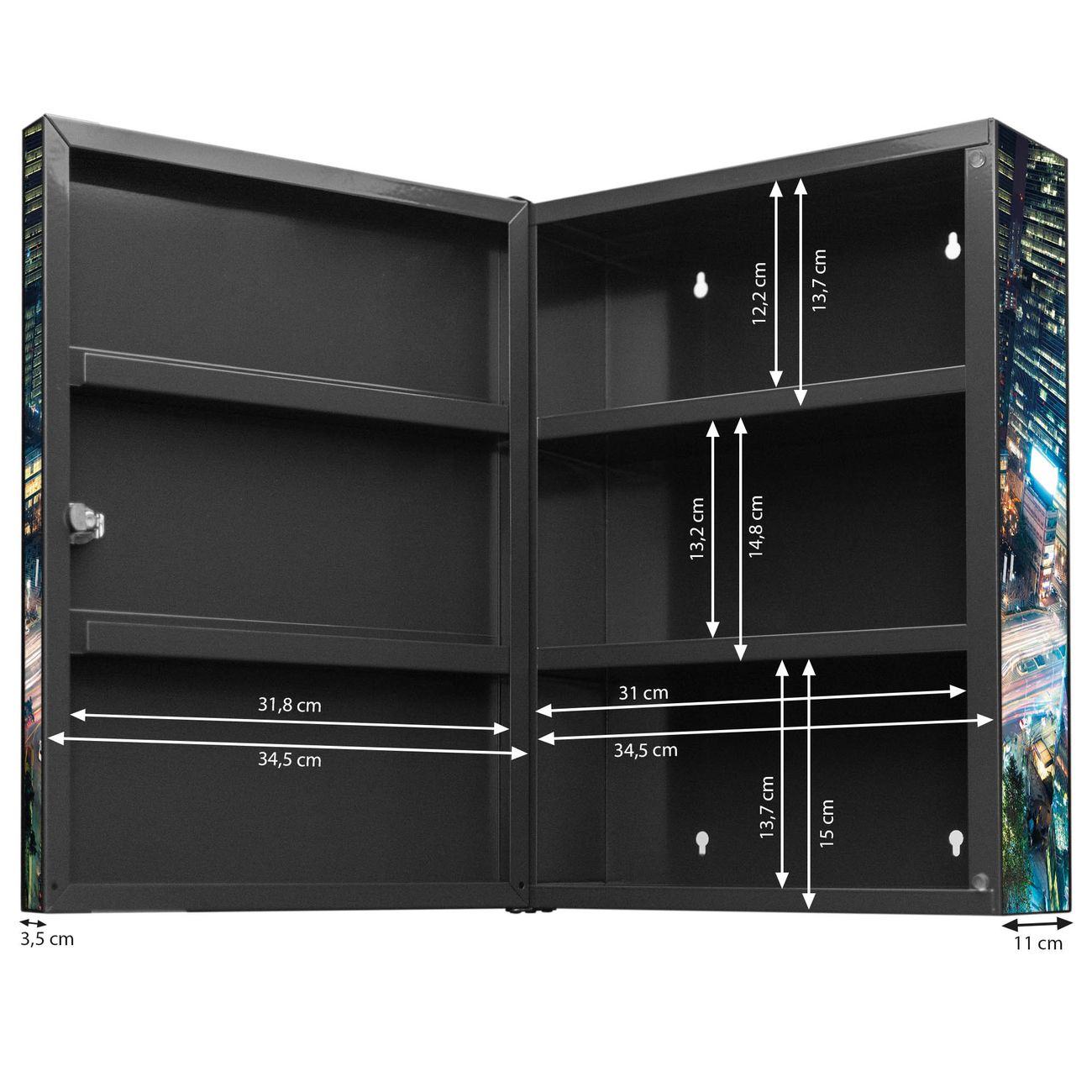 Der Medizinschrank ist gesamt 35x46x15cm groß und wiegt ca. 3900g. Der Türanschlag ist links und kann nicht verändert werden, die Fronttür öffnet ca. 115°. Die Folierung befindet sich auf der Front und den Seiten. Das Gehäuse ist zeitlos anthrazit und aus Stahl gefertigt. Die innenliegenden Fächer haben verschiedene Größen für unterschiedliche Aufbewahrungsmöglichkeiten, in der Innentür können ebenfalls Dinge abgelegt werden. Befestigt wird der Medizinschrank an 4 Stellen auf der Rückseite, Sie erhalten 3 Schlüssel.