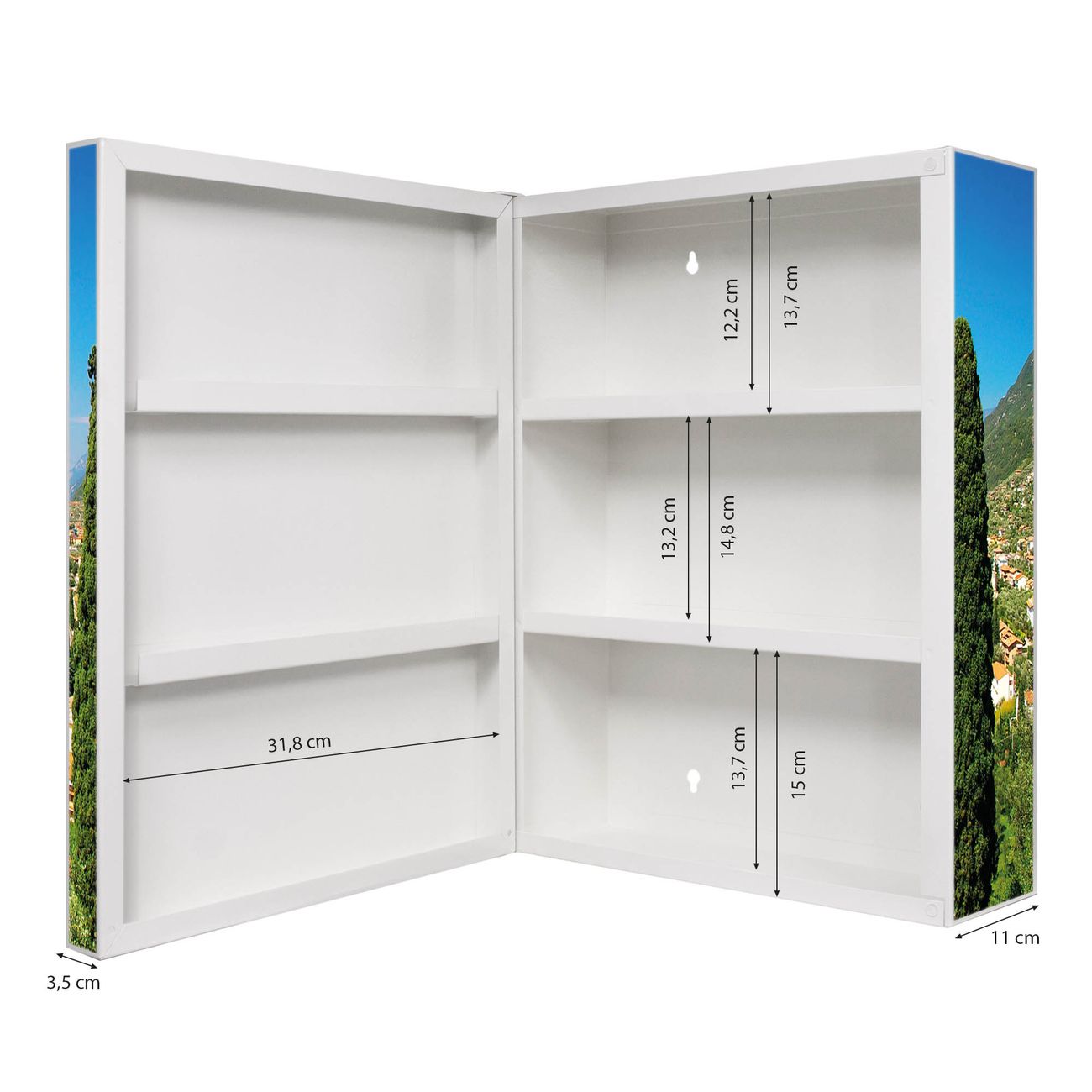 Der Medizinschrank ist gesamt 35x46x15cm groß und wiegt ca. 3900g. Der Türanschlag ist links und kann nicht verändert werden, die Fronttür öffnet ca. 115°. Die Folierung befindet sich auf der Front und den Seiten. Das Gehäuse ist zeitlos weiß und aus Stahl gefertigt. Die innenliegenden Fächer haben verschiedene Größen für unterschiedliche Aufbewahrungsmöglichkeiten, in der Innentür können ebenfalls Dinge abgelegt werden. Befestigt wird der Medizinschrank an 4 Stellen auf der Rückseite, Sie erhalten 3 Schlüssel.