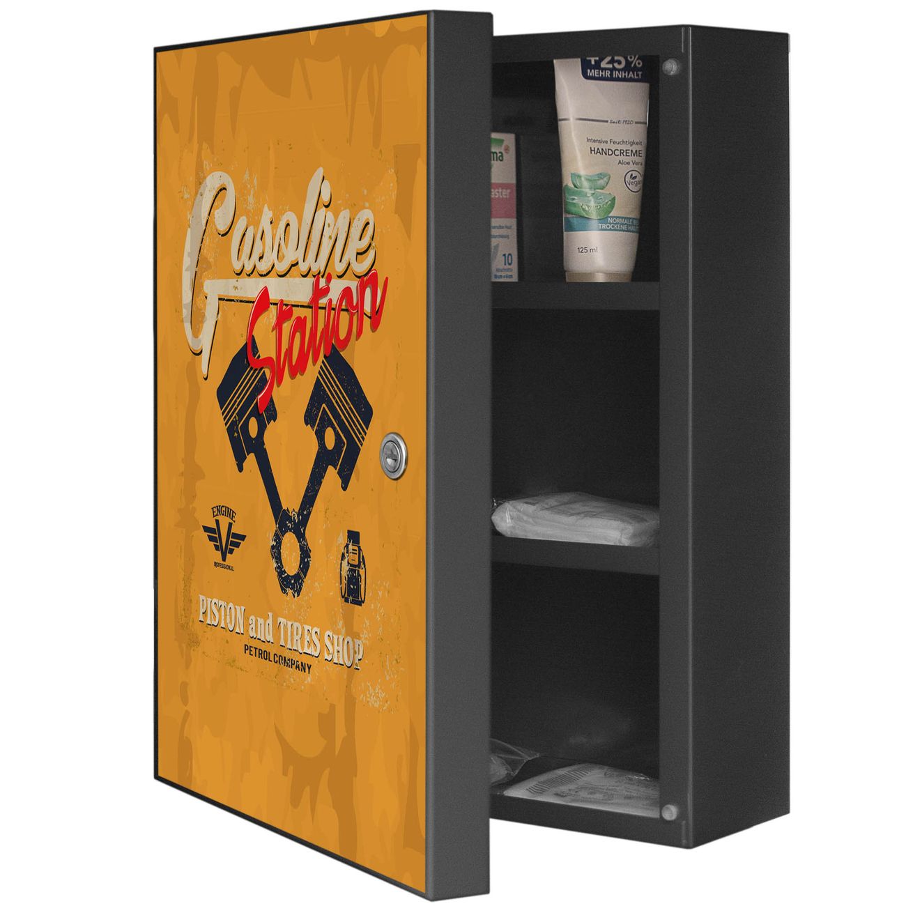 Der Medizinschrank ist gesamt 35x46x15cm groß und wiegt ca. 3900g. Der Türanschlag ist links und kann nicht verändert werden, die Fronttür öffnet ca. 115°. Die Folierung befindet sich auf der Front. Das Gehäuse ist zeitlos anthrazit und aus Stahl gefertigt. Die innenliegenden Fächer haben verschiedene Größen für unterschiedliche Aufbewahrungsmöglichkeiten, in der Innentür können ebenfalls Dinge abgelegt werden. Befestigt wird der Medizinschrank an 4 Stellen auf der Rückseite, Sie erhalten 3 Schlüssel.