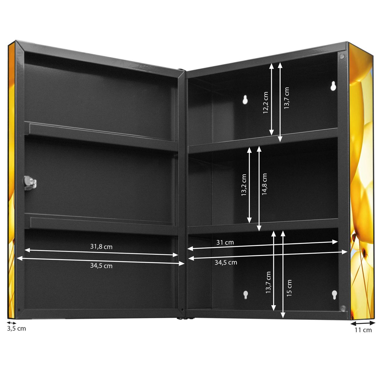 Der Medizinschrank ist gesamt 35x46x15cm groß und wiegt ca. 3900g. Der Türanschlag ist links und kann nicht verändert werden, die Fronttür öffnet ca. 115°. Die Folierung befindet sich auf der Front und den Seiten. Das Gehäuse ist zeitlos anthrazit und aus Stahl gefertigt. Die innenliegenden Fächer haben verschiedene Größen für unterschiedliche Aufbewahrungsmöglichkeiten, in der Innentür können ebenfalls Dinge abgelegt werden. Befestigt wird der Medizinschrank an 4 Stellen auf der Rückseite, Sie erhalten 3 Schlüssel.