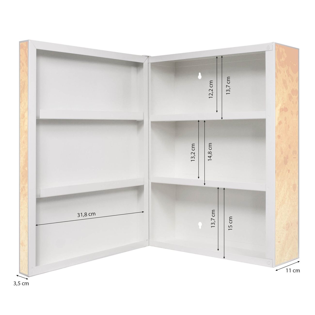 Der Medizinschrank ist gesamt 35x46x15cm groß und wiegt ca. 3900g. Der Türanschlag ist links und kann nicht verändert werden, die Fronttür öffnet ca. 115°. Die Folierung befindet sich auf der Front und den Seiten. Das Gehäuse ist zeitlos weiß und aus Stahl gefertigt. Die innenliegenden Fächer haben verschiedene Größen für unterschiedliche Aufbewahrungsmöglichkeiten, in der Innentür können ebenfalls Dinge abgelegt werden. Befestigt wird der Medizinschrank an 4 Stellen auf der Rückseite, Sie erhalten 3 Schlüssel.