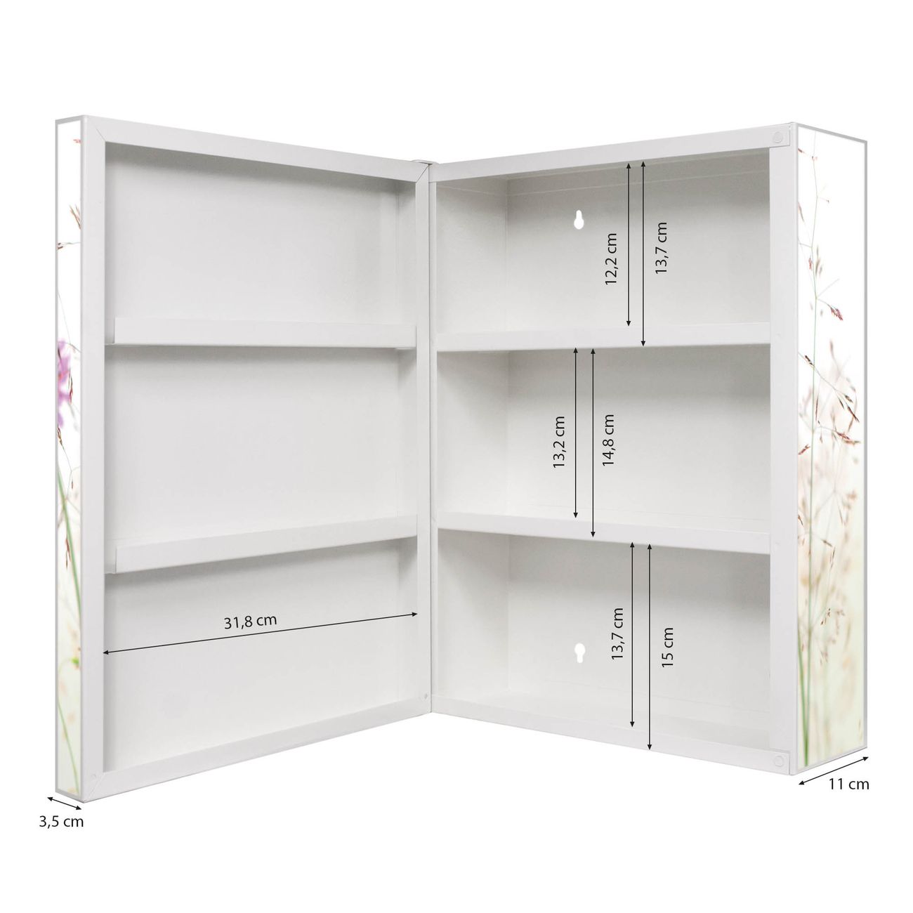 Der Medizinschrank ist gesamt 35x46x15cm groß und wiegt ca. 3900g. Der Türanschlag ist links und kann nicht verändert werden, die Fronttür öffnet ca. 115°. Die Folierung befindet sich auf der Front und den Seiten. Das Gehäuse ist zeitlos weiß und aus Stahl gefertigt. Die innenliegenden Fächer haben verschiedene Größen für unterschiedliche Aufbewahrungsmöglichkeiten, in der Innentür können ebenfalls Dinge abgelegt werden. Befestigt wird der Medizinschrank an 4 Stellen auf der Rückseite, Sie erhalten 3 Schlüssel.