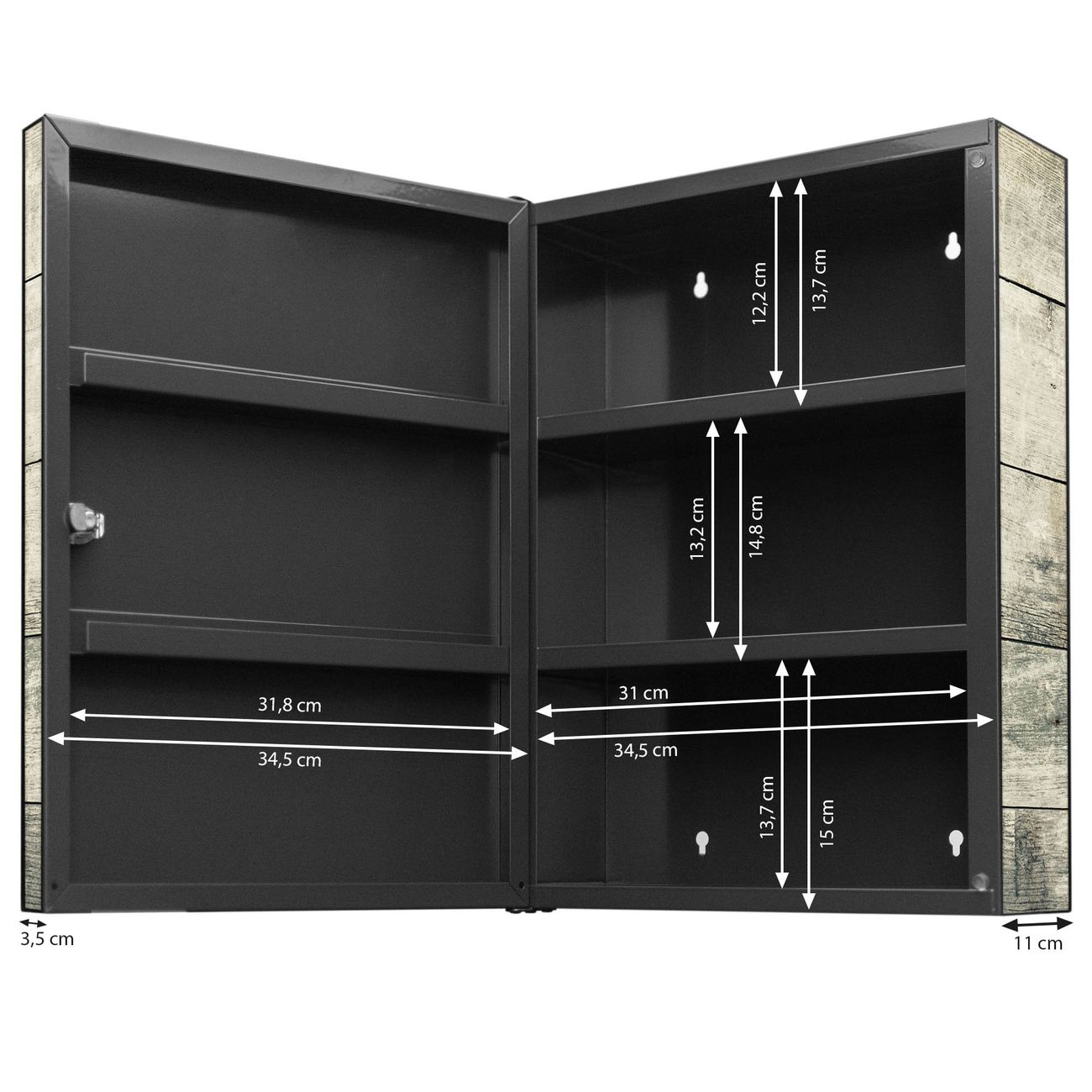 Der Medizinschrank ist gesamt 35x46x15cm groß und wiegt ca. 3900g. Der Türanschlag ist links und kann nicht verändert werden, die Fronttür öffnet ca. 115°. Die Folierung befindet sich auf der Front und den Seiten. Das Gehäuse ist zeitlos anthrazit und aus Stahl gefertigt. Die innenliegenden Fächer haben verschiedene Größen für unterschiedliche Aufbewahrungsmöglichkeiten, in der Innentür können ebenfalls Dinge abgelegt werden. Befestigt wird der Medizinschrank an 4 Stellen auf der Rückseite, Sie erhalten 3 Schlüssel.