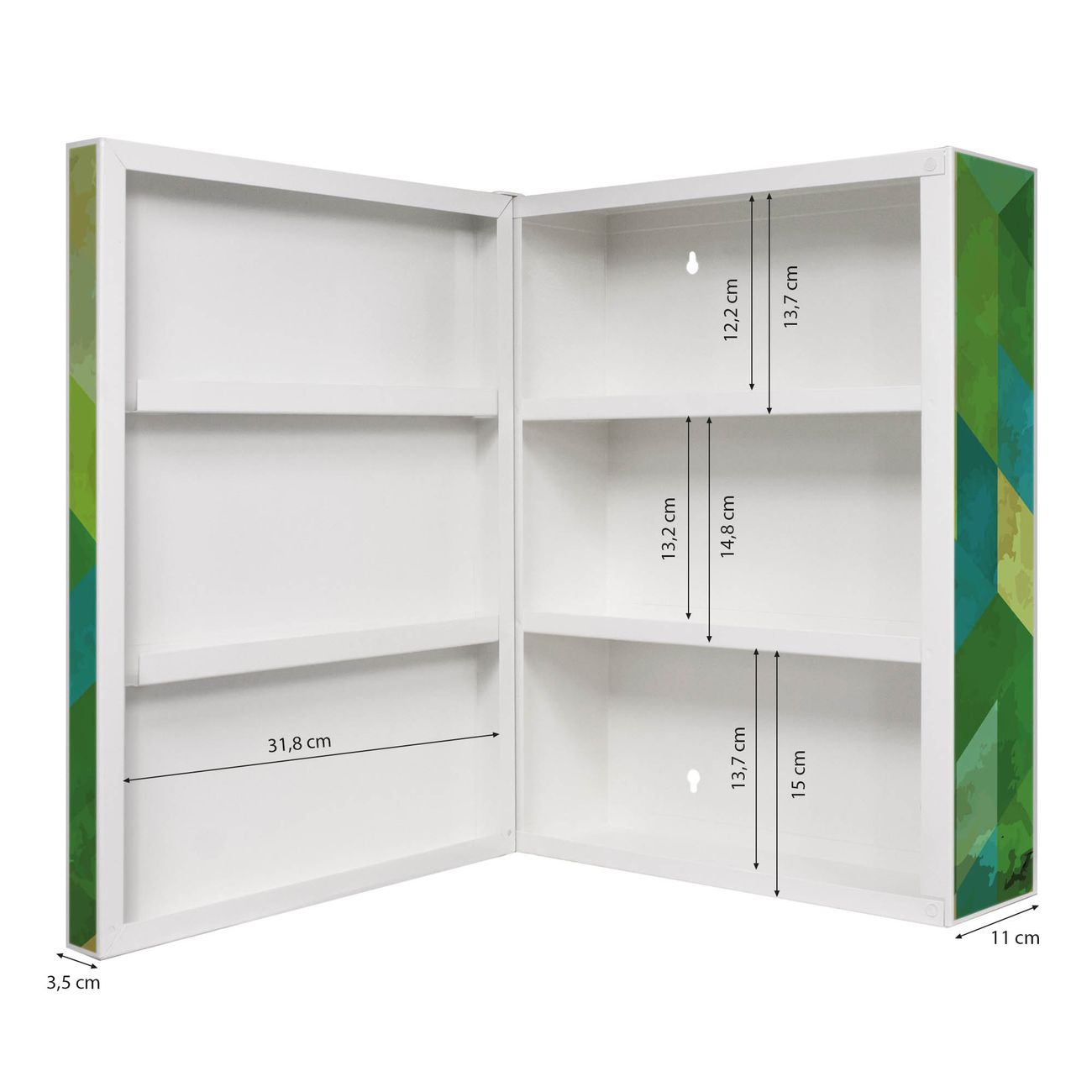 Der Medizinschrank ist gesamt 35x46x15cm groß und wiegt ca. 3900g. Der Türanschlag ist links und kann nicht verändert werden, die Fronttür öffnet ca. 115°. Die Folierung befindet sich auf der Front und den Seiten. Das Gehäuse ist zeitlos weiß und aus Stahl gefertigt. Die innenliegenden Fächer haben verschiedene Größen für unterschiedliche Aufbewahrungsmöglichkeiten, in der Innentür können ebenfalls Dinge abgelegt werden. Befestigt wird der Medizinschrank an 4 Stellen auf der Rückseite, Sie erhalten 3 Schlüssel.