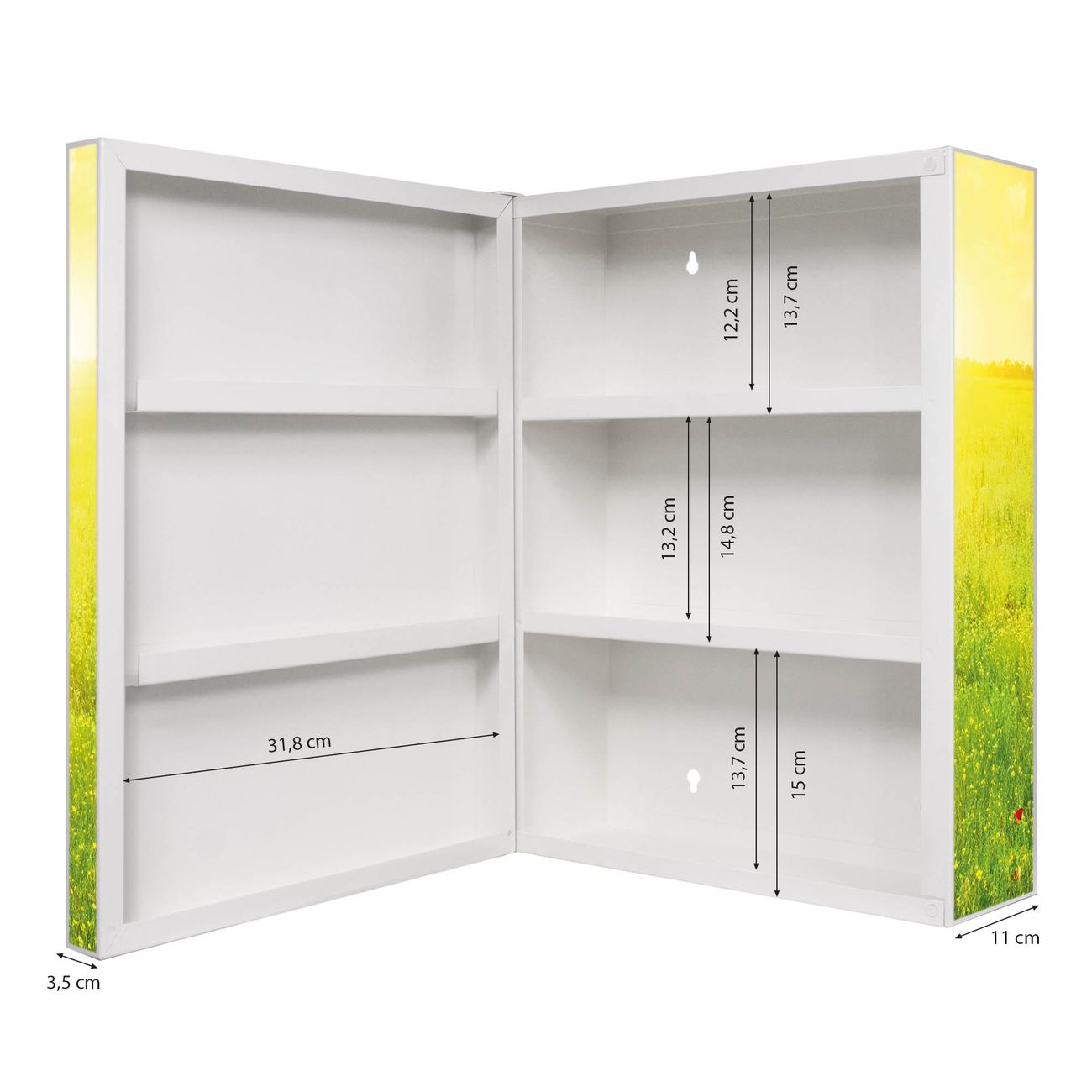 Der Medizinschrank ist gesamt 35x46x15cm groß und wiegt ca. 3900g. Der Türanschlag ist links und kann nicht verändert werden, die Fronttür öffnet ca. 115°. Die Folierung befindet sich auf der Front und den Seiten. Das Gehäuse ist zeitlos weiß und aus Stahl gefertigt. Die innenliegenden Fächer haben verschiedene Größen für unterschiedliche Aufbewahrungsmöglichkeiten, in der Innentür können ebenfalls Dinge abgelegt werden. Befestigt wird der Medizinschrank an 4 Stellen auf der Rückseite, Sie erhalten 3 Schlüssel.