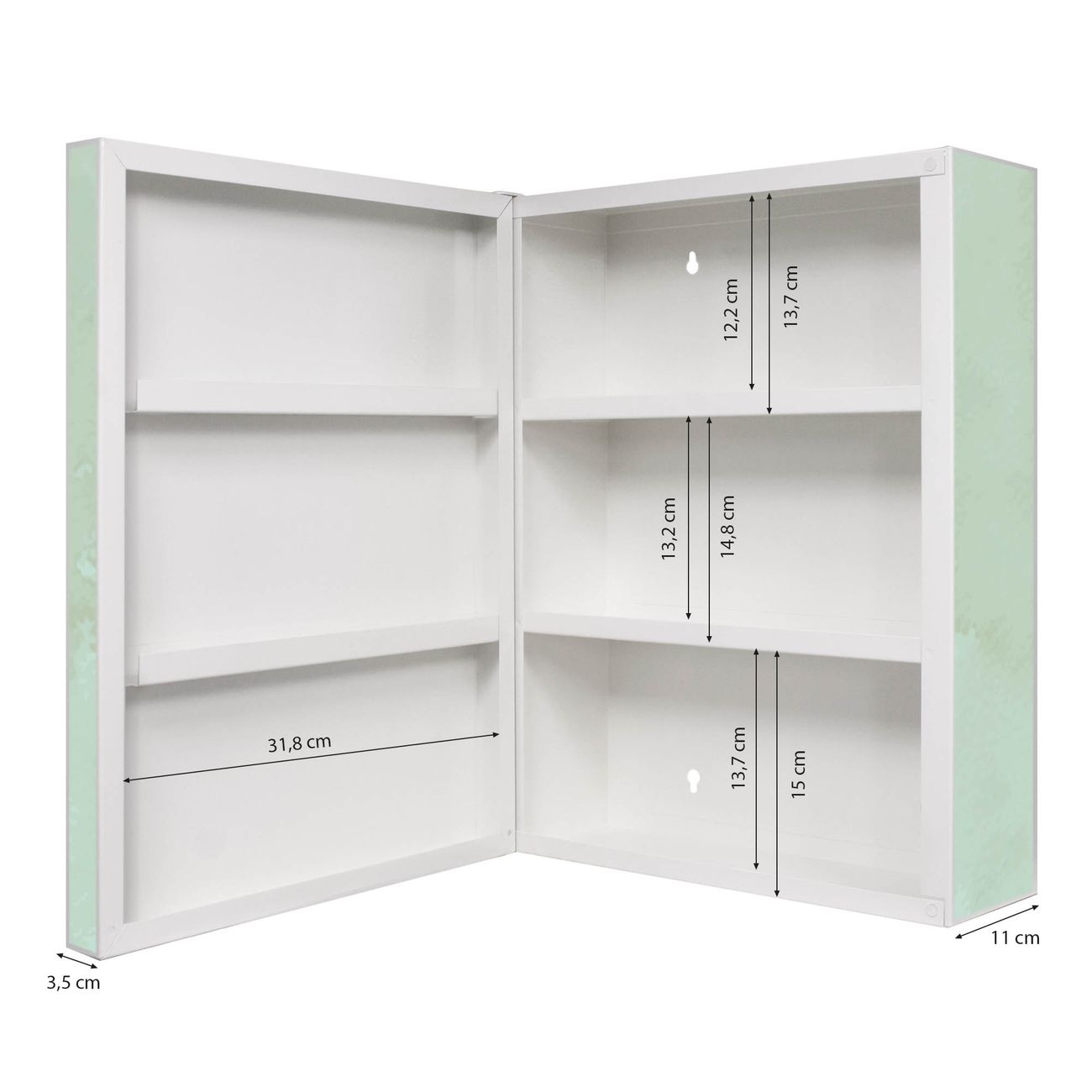 Der Medizinschrank ist gesamt 35x46x15cm groß und wiegt ca. 3900g. Der Türanschlag ist links und kann nicht verändert werden, die Fronttür öffnet ca. 115°. Die Folierung befindet sich auf der Front und den Seiten. Das Gehäuse ist zeitlos weiß und aus Stahl gefertigt. Die innenliegenden Fächer haben verschiedene Größen für unterschiedliche Aufbewahrungsmöglichkeiten, in der Innentür können ebenfalls Dinge abgelegt werden. Befestigt wird der Medizinschrank an 4 Stellen auf der Rückseite, Sie erhalten 3 Schlüssel.