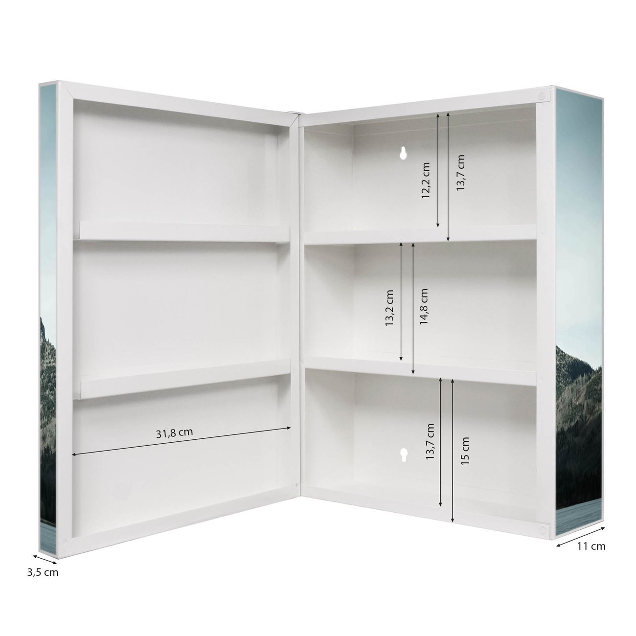 Der Medizinschrank ist gesamt 35x46x15cm groß und wiegt ca. 3900g. Der Türanschlag ist links und kann nicht verändert werden, die Fronttür öffnet ca. 115°. Die Folierung befindet sich auf der Front und den Seiten. Das Gehäuse ist zeitlos weiß und aus Stahl gefertigt. Die innenliegenden Fächer haben verschiedene Größen für unterschiedliche Aufbewahrungsmöglichkeiten, in der Innentür können ebenfalls Dinge abgelegt werden. Befestigt wird der Medizinschrank an 4 Stellen auf der Rückseite, Sie erhalten 3 Schlüssel.
