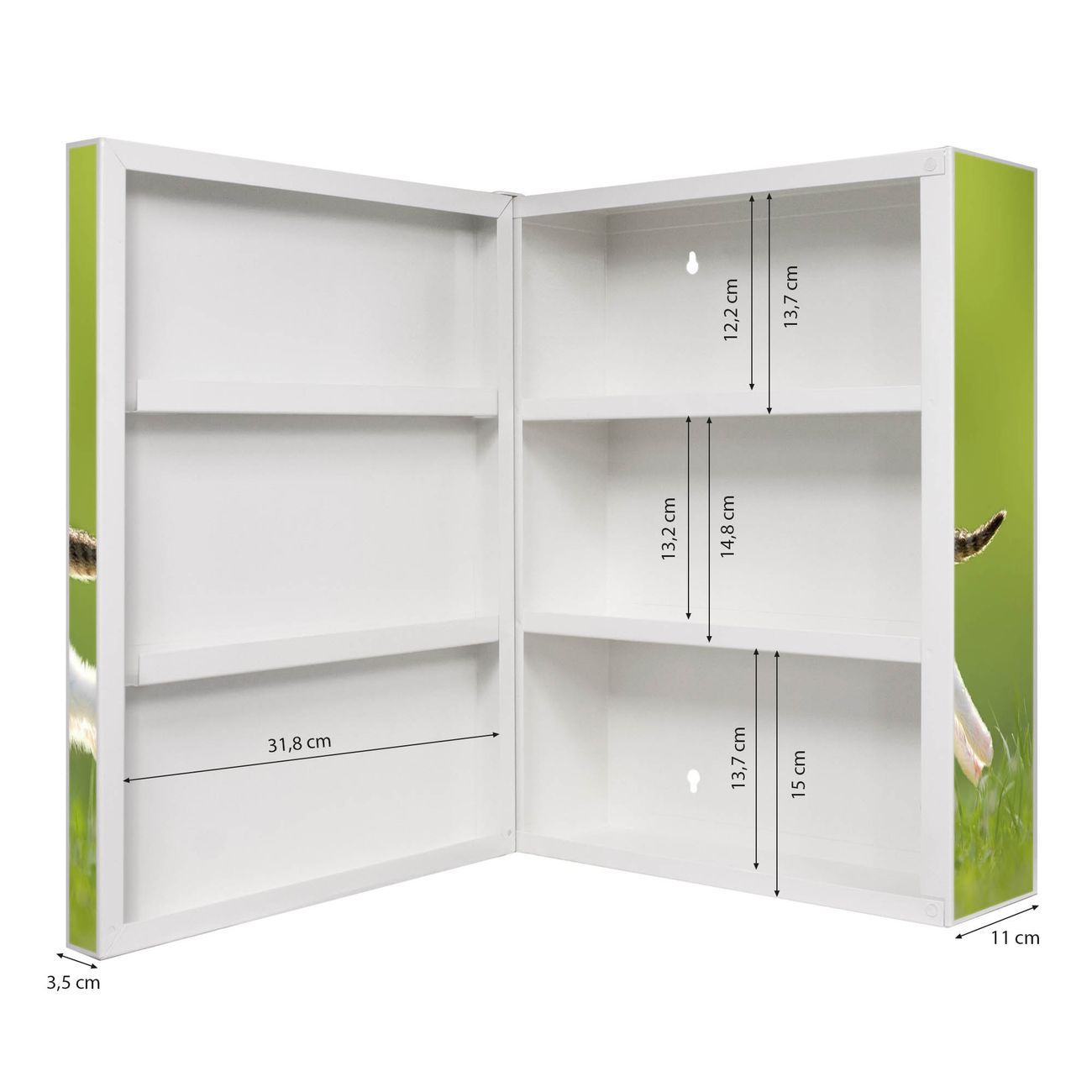 Der Medizinschrank ist gesamt 35x46x15cm groß und wiegt ca. 3900g. Der Türanschlag ist links und kann nicht verändert werden, die Fronttür öffnet ca. 115°. Die Folierung befindet sich auf der Front und den Seiten. Das Gehäuse ist zeitlos weiß und aus Stahl gefertigt. Die innenliegenden Fächer haben verschiedene Größen für unterschiedliche Aufbewahrungsmöglichkeiten, in der Innentür können ebenfalls Dinge abgelegt werden. Befestigt wird der Medizinschrank an 4 Stellen auf der Rückseite, Sie erhalten 3 Schlüssel.
