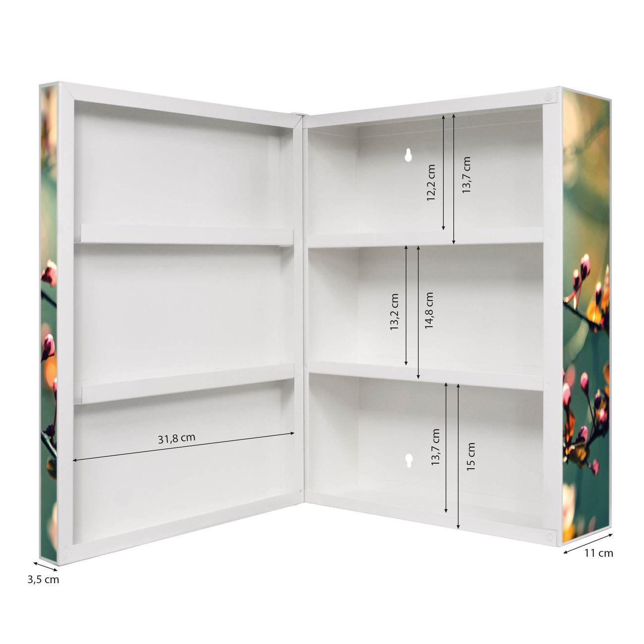 Der Medizinschrank ist gesamt 35x46x15cm groß und wiegt ca. 3900g. Der Türanschlag ist links und kann nicht verändert werden, die Fronttür öffnet ca. 115°. Die Folierung befindet sich auf der Front und den Seiten. Das Gehäuse ist zeitlos weiß und aus Stahl gefertigt. Die innenliegenden Fächer haben verschiedene Größen für unterschiedliche Aufbewahrungsmöglichkeiten, in der Innentür können ebenfalls Dinge abgelegt werden. Befestigt wird der Medizinschrank an 4 Stellen auf der Rückseite, Sie erhalten 3 Schlüssel.