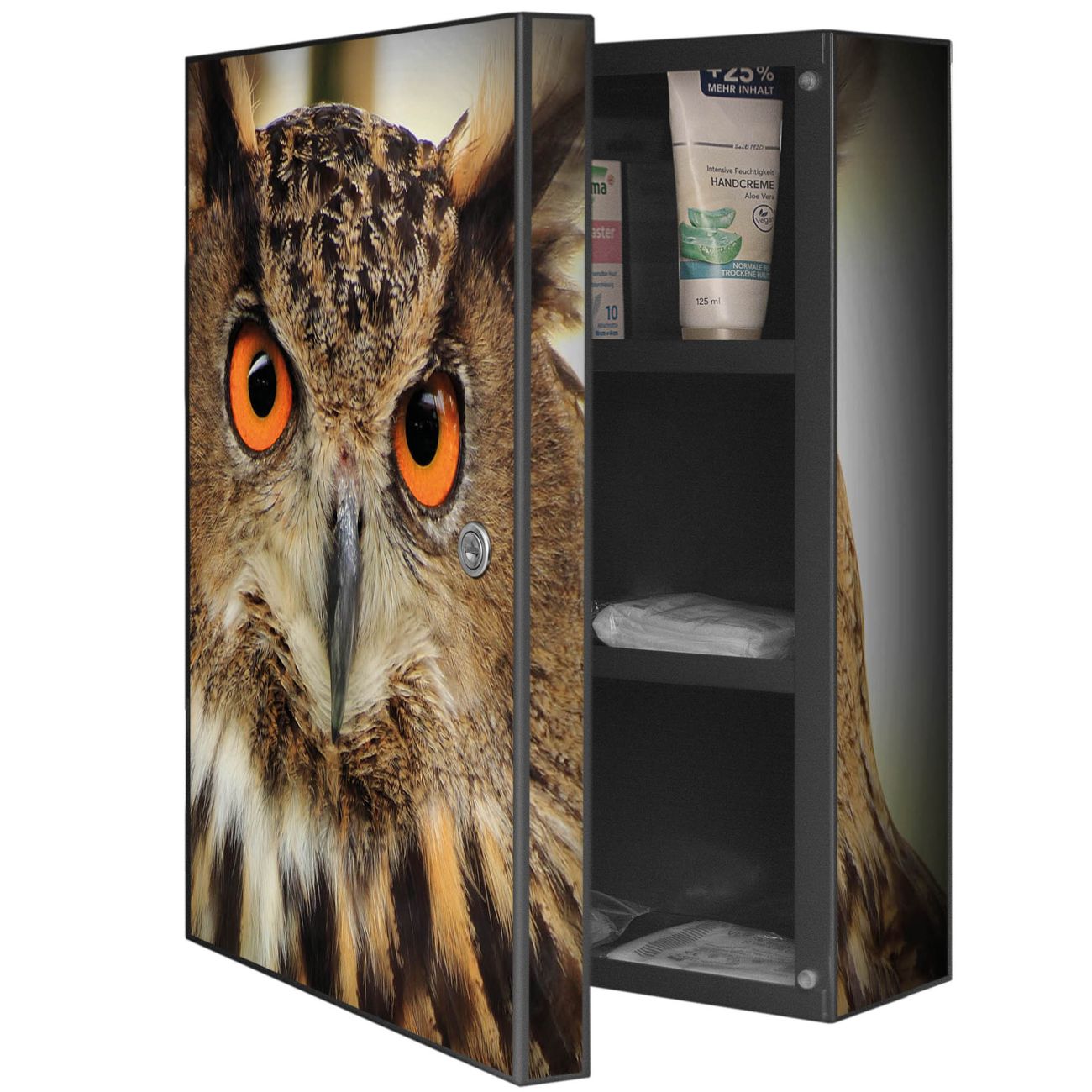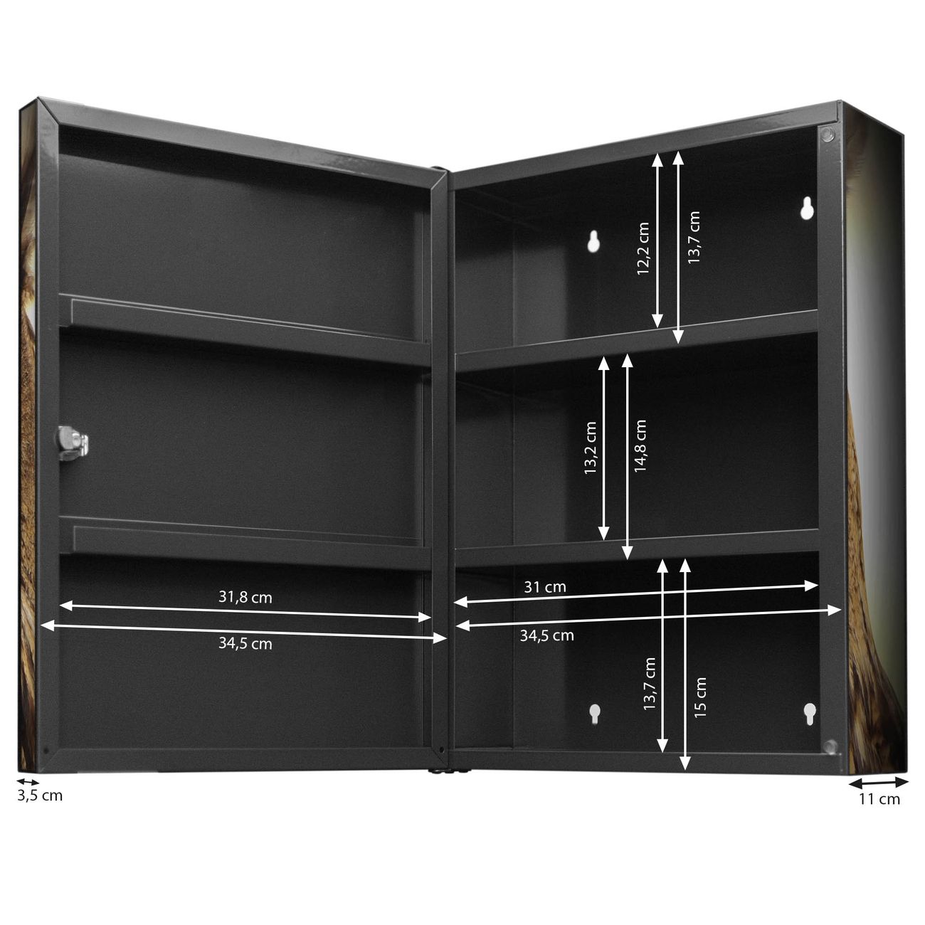 Der Medizinschrank ist gesamt 35x46x15cm groß und wiegt ca. 3900g. Der Türanschlag ist links und kann nicht verändert werden, die Fronttür öffnet ca. 115°. Die Folierung befindet sich auf der Front und den Seiten. Das Gehäuse ist zeitlos anthrazit und aus Stahl gefertigt. Die innenliegenden Fächer haben verschiedene Größen für unterschiedliche Aufbewahrungsmöglichkeiten, in der Innentür können ebenfalls Dinge abgelegt werden. Befestigt wird der Medizinschrank an 4 Stellen auf der Rückseite, Sie erhalten 3 Schlüssel.
