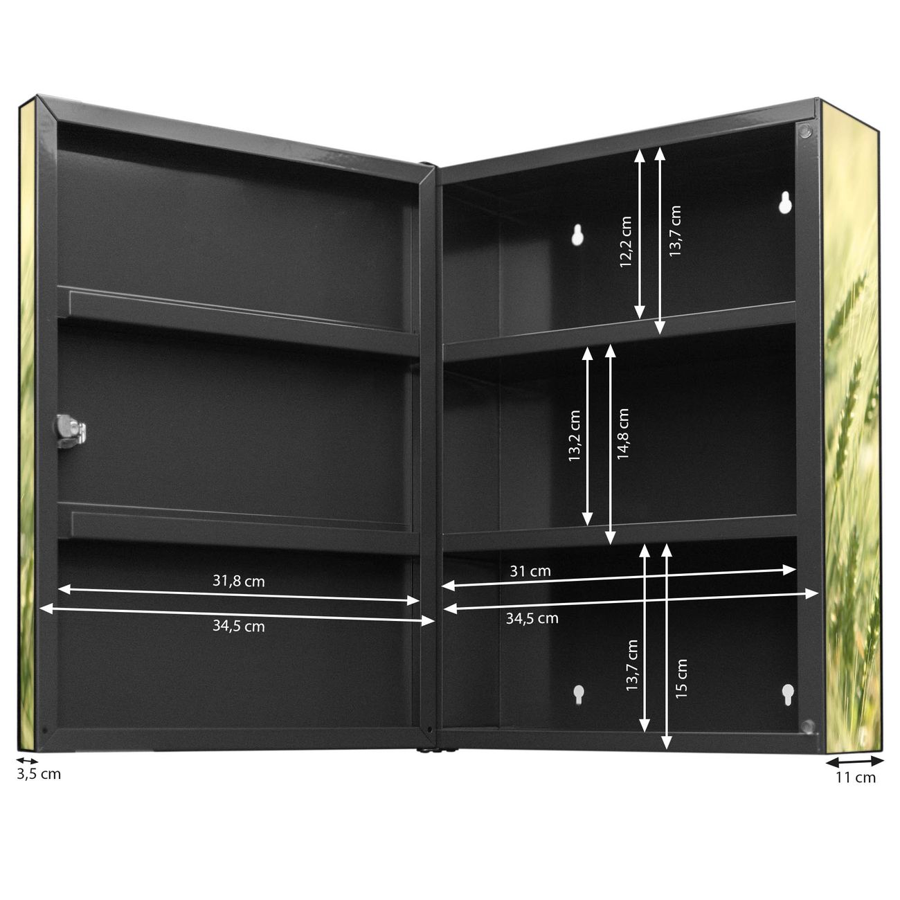 Der Medizinschrank ist gesamt 35x46x15cm groß und wiegt ca. 3900g. Der Türanschlag ist links und kann nicht verändert werden, die Fronttür öffnet ca. 115°. Die Folierung befindet sich auf der Front und den Seiten. Das Gehäuse ist zeitlos anthrazit und aus Stahl gefertigt. Die innenliegenden Fächer haben verschiedene Größen für unterschiedliche Aufbewahrungsmöglichkeiten, in der Innentür können ebenfalls Dinge abgelegt werden. Befestigt wird der Medizinschrank an 4 Stellen auf der Rückseite, Sie erhalten 3 Schlüssel.