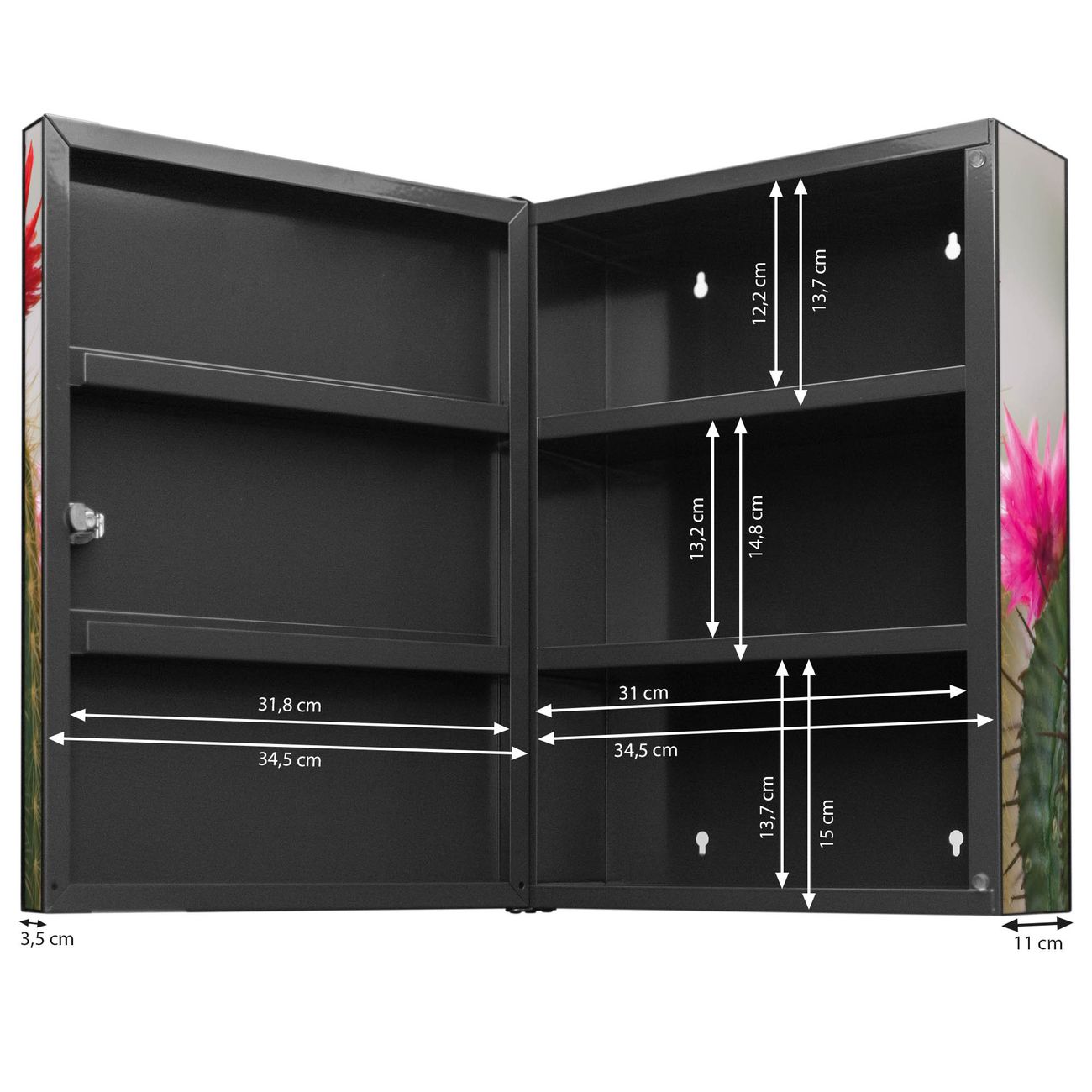 Der Medizinschrank ist gesamt 35x46x15cm groß und wiegt ca. 3900g. Der Türanschlag ist links und kann nicht verändert werden, die Fronttür öffnet ca. 115°. Die Folierung befindet sich auf der Front und den Seiten. Das Gehäuse ist zeitlos anthrazit und aus Stahl gefertigt. Die innenliegenden Fächer haben verschiedene Größen für unterschiedliche Aufbewahrungsmöglichkeiten, in der Innentür können ebenfalls Dinge abgelegt werden. Befestigt wird der Medizinschrank an 4 Stellen auf der Rückseite, Sie erhalten 3 Schlüssel.