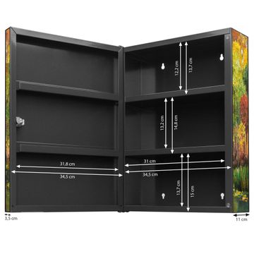 Der Medizinschrank ist gesamt 35x46x15cm groß und wiegt ca. 3900g. Der Türanschlag ist links und kann nicht verändert werden, die Fronttür öffnet ca. 115°. Die Folierung befindet sich auf der Front und den Seiten. Das Gehäuse ist zeitlos anthrazit und aus Stahl gefertigt. Die innenliegenden Fächer haben verschiedene Größen für unterschiedliche Aufbewahrungsmöglichkeiten, in der Innentür können ebenfalls Dinge abgelegt werden. Befestigt wird der Medizinschrank an 4 Stellen auf der Rückseite, Sie erhalten 3 Schlüssel.
