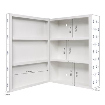 Der Medizinschrank ist gesamt 35x46x15cm groß und wiegt ca. 3900g. Der Türanschlag ist links und kann nicht verändert werden, die Fronttür öffnet ca. 115°. Die Folierung befindet sich auf der Front und den Seiten. Das Gehäuse ist zeitlos weiß und aus Stahl gefertigt. Die innenliegenden Fächer haben verschiedene Größen für unterschiedliche Aufbewahrungsmöglichkeiten, in der Innentür können ebenfalls Dinge abgelegt werden. Befestigt wird der Medizinschrank an 4 Stellen auf der Rückseite, Sie erhalten 3 Schlüssel.