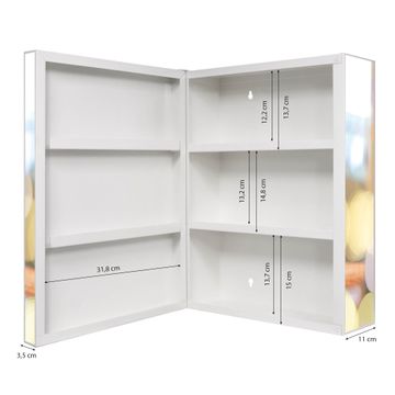 Der Medizinschrank ist gesamt 35x46x15cm groß und wiegt ca. 3900g. Der Türanschlag ist links und kann nicht verändert werden, die Fronttür öffnet ca. 115°. Die Folierung befindet sich auf der Front und den Seiten. Das Gehäuse ist zeitlos weiß und aus Stahl gefertigt. Die innenliegenden Fächer haben verschiedene Größen für unterschiedliche Aufbewahrungsmöglichkeiten, in der Innentür können ebenfalls Dinge abgelegt werden. Befestigt wird der Medizinschrank an 4 Stellen auf der Rückseite, Sie erhalten 3 Schlüssel.