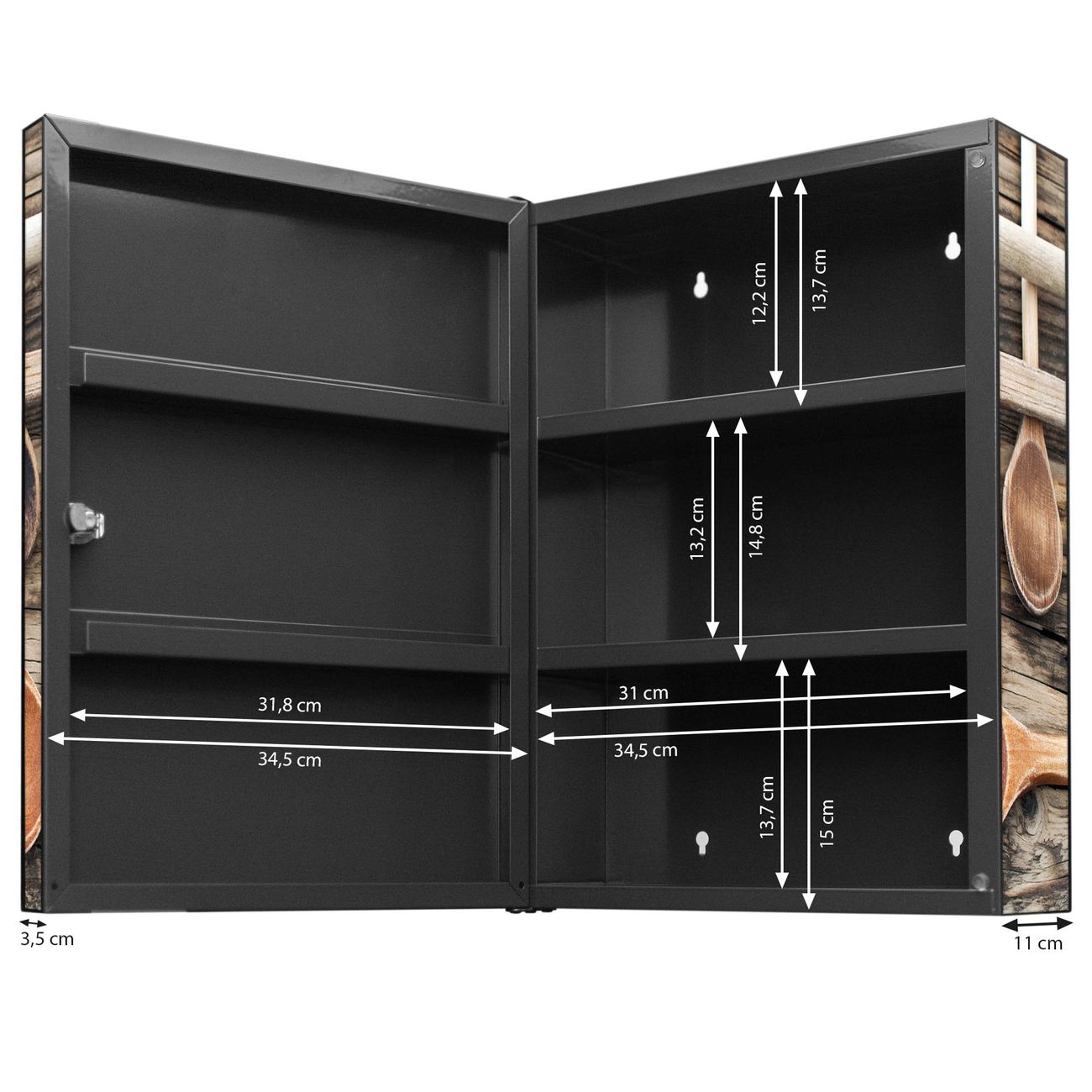 Der Medizinschrank ist gesamt 35x46x15cm groß und wiegt ca. 3900g. Der Türanschlag ist links und kann nicht verändert werden, die Fronttür öffnet ca. 115°. Die Folierung befindet sich auf der Front und den Seiten. Das Gehäuse ist zeitlos anthrazit und aus Stahl gefertigt. Die innenliegenden Fächer haben verschiedene Größen für unterschiedliche Aufbewahrungsmöglichkeiten, in der Innentür können ebenfalls Dinge abgelegt werden. Befestigt wird der Medizinschrank an 4 Stellen auf der Rückseite, Sie erhalten 3 Schlüssel.