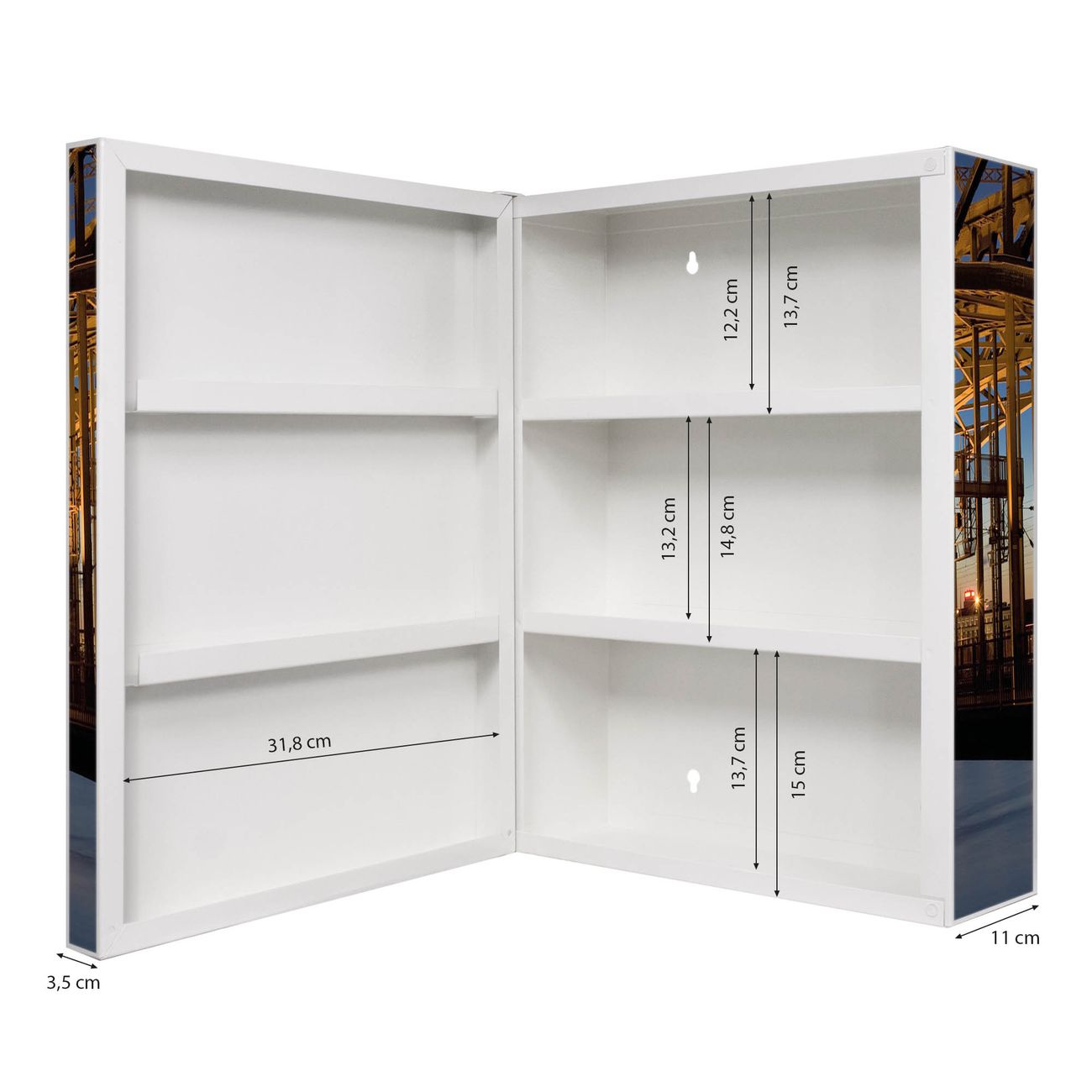 Der Medizinschrank ist gesamt 35x46x15cm groß und wiegt ca. 3900g. Der Türanschlag ist links und kann nicht verändert werden, die Fronttür öffnet ca. 115°. Die Folierung befindet sich auf der Front und den Seiten. Das Gehäuse ist zeitlos weiß und aus Stahl gefertigt. Die innenliegenden Fächer haben verschiedene Größen für unterschiedliche Aufbewahrungsmöglichkeiten, in der Innentür können ebenfalls Dinge abgelegt werden. Befestigt wird der Medizinschrank an 4 Stellen auf der Rückseite, Sie erhalten 3 Schlüssel.