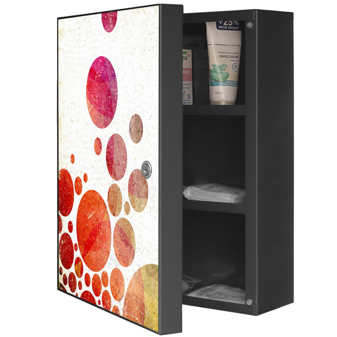 Der Medizinschrank ist gesamt 35x46x15cm groß und wiegt ca. 3900g. Der Türanschlag ist links und kann nicht verändert werden, die Fronttür öffnet ca. 115°. Die Folierung befindet sich auf der Front. Das Gehäuse ist zeitlos anthrazit und aus Stahl gefertigt. Die innenliegenden Fächer haben verschiedene Größen für unterschiedliche Aufbewahrungsmöglichkeiten, in der Innentür können ebenfalls Dinge abgelegt werden. Befestigt wird der Medizinschrank an 4 Stellen auf der Rückseite, Sie erhalten 3 Schlüssel.