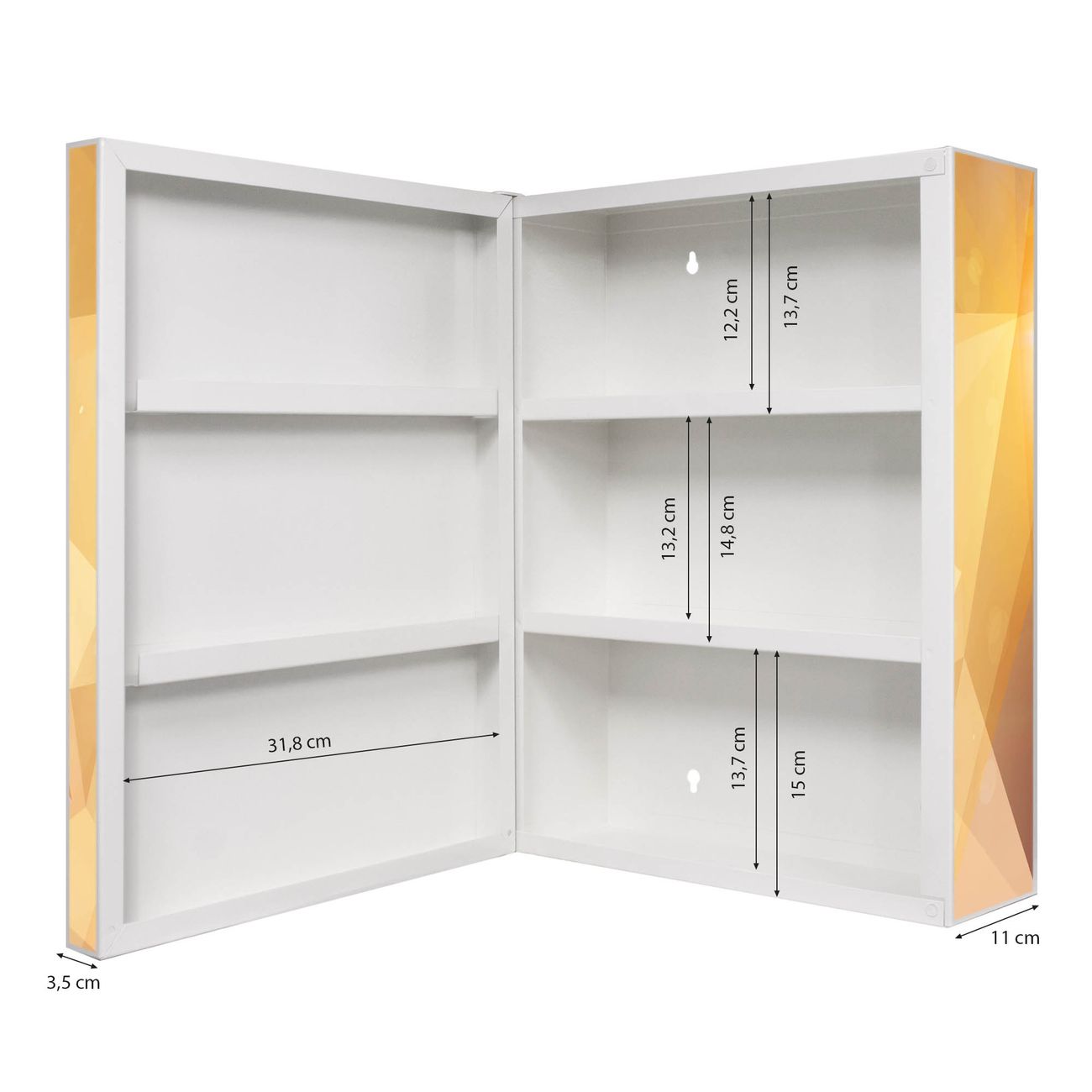 Der Medizinschrank ist gesamt 35x46x15cm groß und wiegt ca. 3900g. Der Türanschlag ist links und kann nicht verändert werden, die Fronttür öffnet ca. 115°. Die Folierung befindet sich auf der Front und den Seiten. Das Gehäuse ist zeitlos weiß und aus Stahl gefertigt. Die innenliegenden Fächer haben verschiedene Größen für unterschiedliche Aufbewahrungsmöglichkeiten, in der Innentür können ebenfalls Dinge abgelegt werden. Befestigt wird der Medizinschrank an 4 Stellen auf der Rückseite, Sie erhalten 3 Schlüssel.