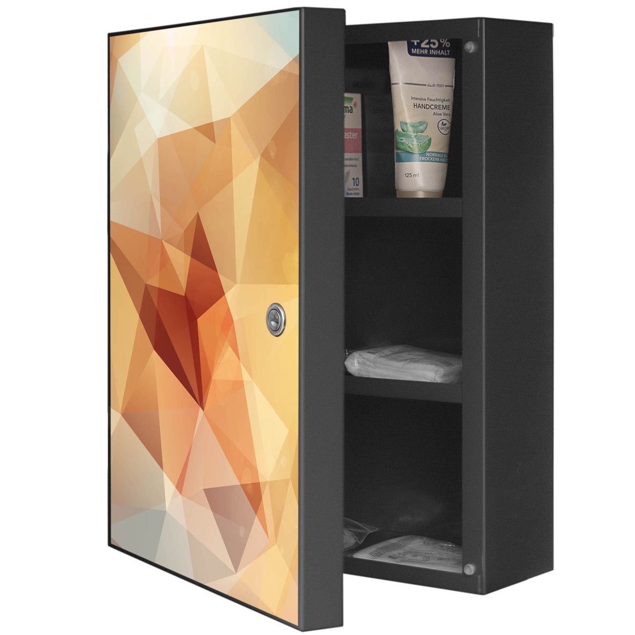 Der Medizinschrank ist gesamt 35x46x15cm groß und wiegt ca. 3900g. Der Türanschlag ist links und kann nicht verändert werden, die Fronttür öffnet ca. 115°. Die Folierung befindet sich auf der Front. Das Gehäuse ist zeitlos anthrazit und aus Stahl gefertigt. Die innenliegenden Fächer haben verschiedene Größen für unterschiedliche Aufbewahrungsmöglichkeiten, in der Innentür können ebenfalls Dinge abgelegt werden. Befestigt wird der Medizinschrank an 4 Stellen auf der Rückseite, Sie erhalten 3 Schlüssel.