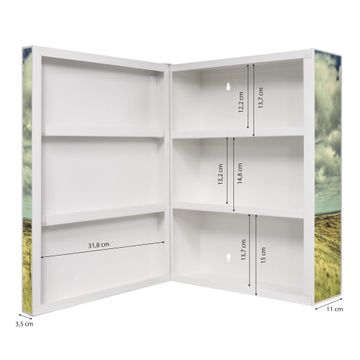 Der Medizinschrank ist gesamt 35x46x15cm groß und wiegt ca. 3900g. Der Türanschlag ist links und kann nicht verändert werden, die Fronttür öffnet ca. 115°. Die Folierung befindet sich auf der Front und den Seiten. Das Gehäuse ist zeitlos weiß und aus Stahl gefertigt. Die innenliegenden Fächer haben verschiedene Größen für unterschiedliche Aufbewahrungsmöglichkeiten, in der Innentür können ebenfalls Dinge abgelegt werden. Befestigt wird der Medizinschrank an 4 Stellen auf der Rückseite, Sie erhalten 3 Schlüssel.