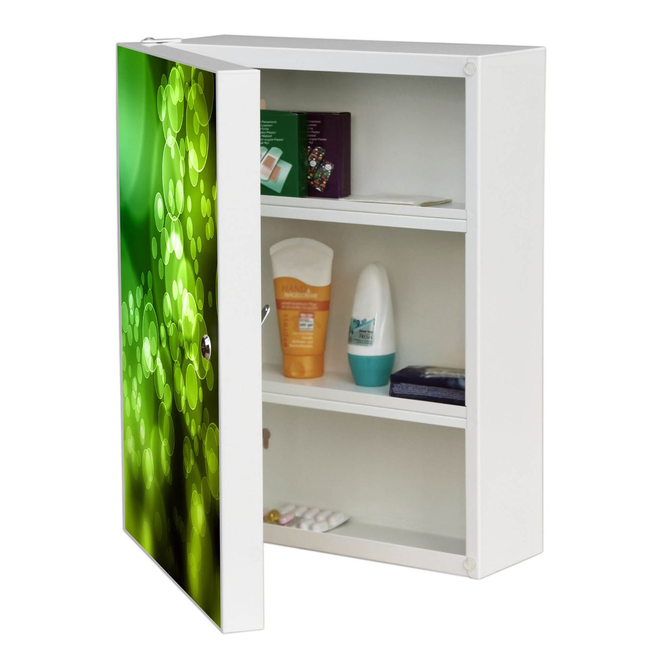 Der Medizinschrank ist gesamt 35x46x15cm groß und wiegt ca. 3900g. Der Türanschlag ist links und kann nicht verändert werden, die Fronttür öffnet ca. 115°. Die Folierung befindet sich auf der Front. Das Gehäuse ist zeitlos weiß und aus Stahl gefertigt. Die innenliegenden Fächer haben verschiedene Größen für unterschiedliche Aufbewahrungsmöglichkeiten, in der Innentür können ebenfalls Dinge abgelegt werden. Befestigt wird der Medizinschrank an 4 Stellen auf der Rückseite, Sie erhalten 3 Schlüssel.