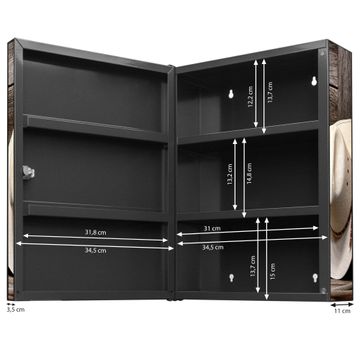 Der Medizinschrank ist gesamt 35x46x15cm groß und wiegt ca. 3900g. Der Türanschlag ist links und kann nicht verändert werden, die Fronttür öffnet ca. 115°. Die Folierung befindet sich auf der Front und den Seiten. Das Gehäuse ist zeitlos anthrazit und aus Stahl gefertigt. Die innenliegenden Fächer haben verschiedene Größen für unterschiedliche Aufbewahrungsmöglichkeiten, in der Innentür können ebenfalls Dinge abgelegt werden. Befestigt wird der Medizinschrank an 4 Stellen auf der Rückseite, Sie erhalten 3 Schlüssel.