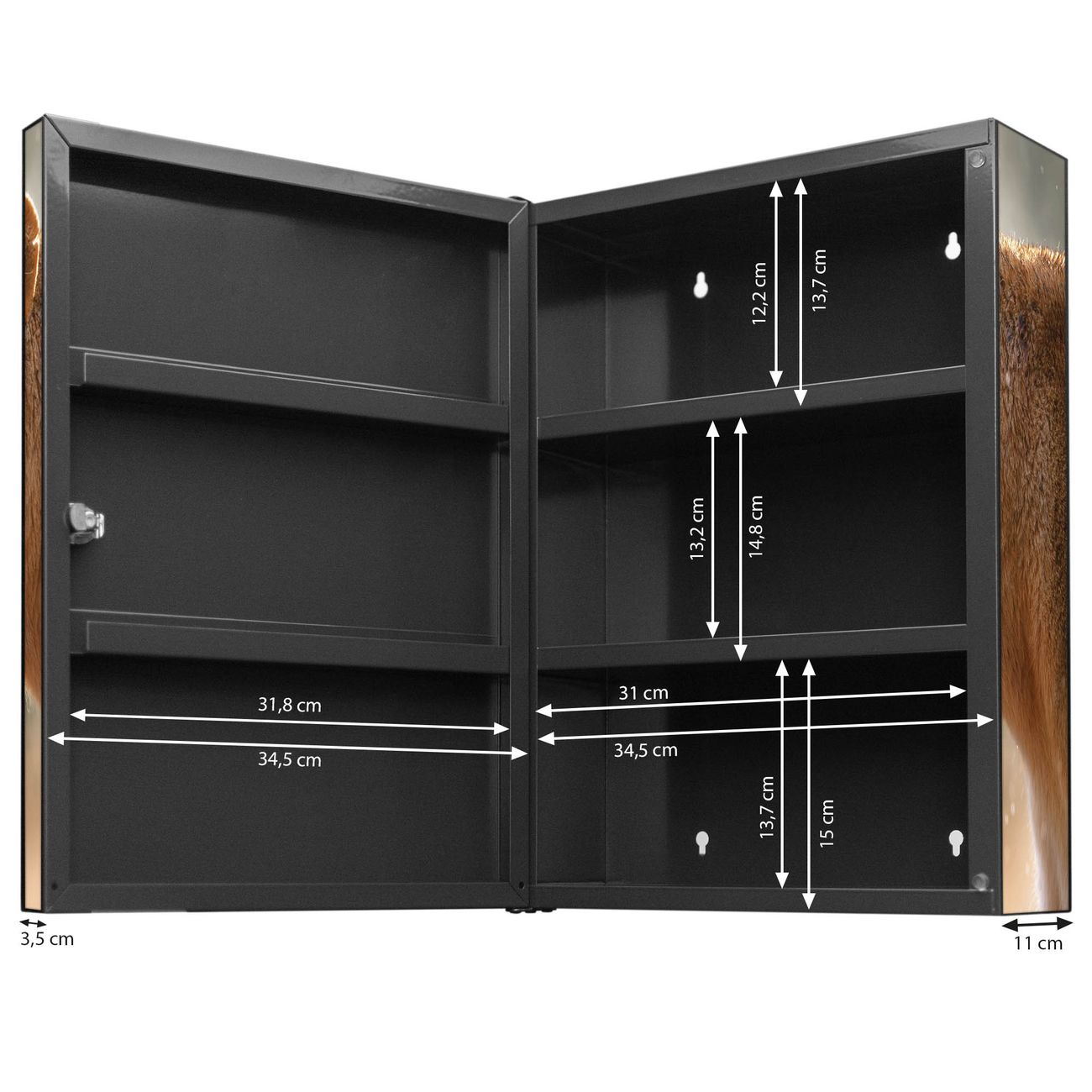Der Medizinschrank ist gesamt 35x46x15cm groß und wiegt ca. 3900g. Der Türanschlag ist links und kann nicht verändert werden, die Fronttür öffnet ca. 115°. Die Folierung befindet sich auf der Front und den Seiten. Das Gehäuse ist zeitlos anthrazit und aus Stahl gefertigt. Die innenliegenden Fächer haben verschiedene Größen für unterschiedliche Aufbewahrungsmöglichkeiten, in der Innentür können ebenfalls Dinge abgelegt werden. Befestigt wird der Medizinschrank an 4 Stellen auf der Rückseite, Sie erhalten 3 Schlüssel.
