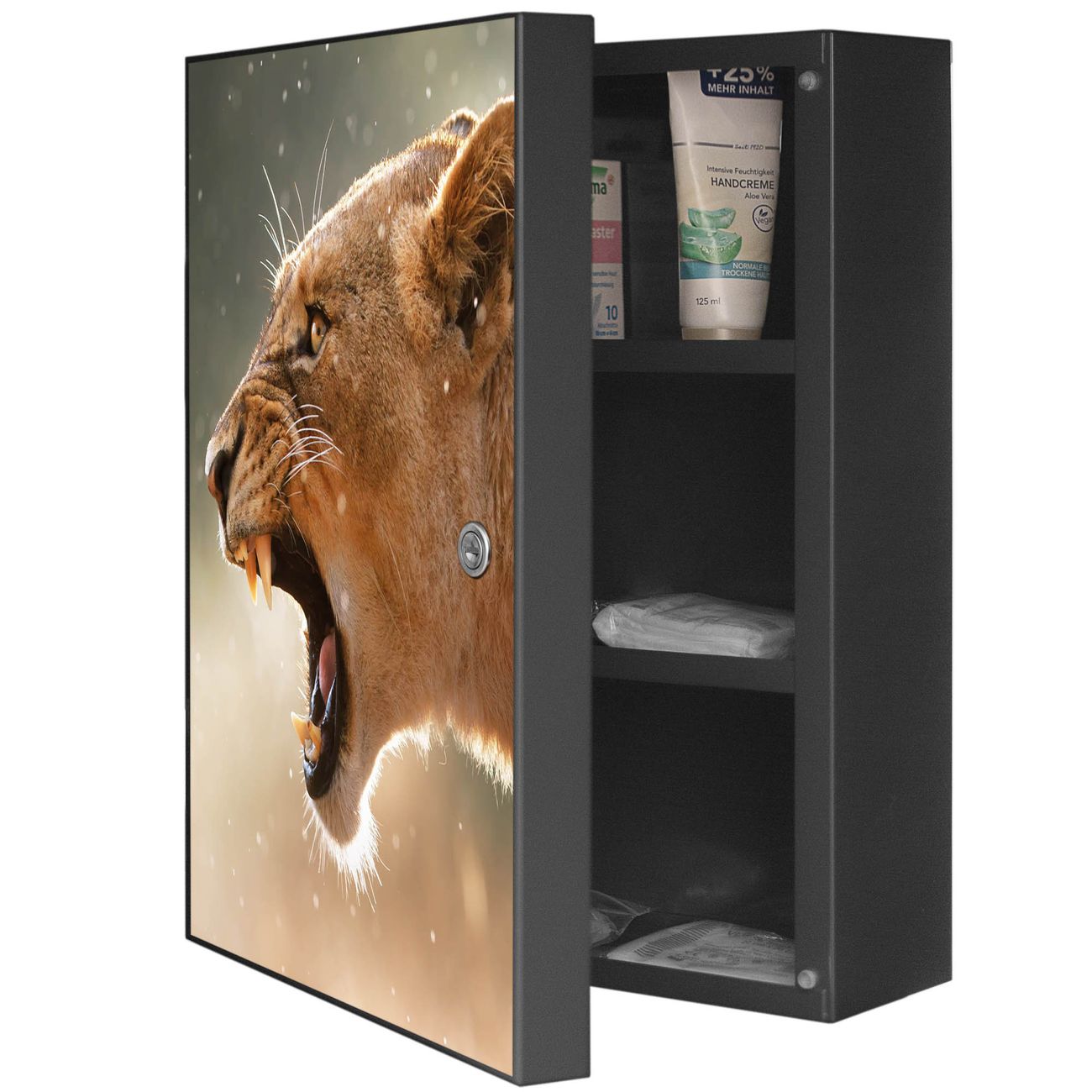 Der Medizinschrank ist gesamt 35x46x15cm groß und wiegt ca. 3900g. Der Türanschlag ist links und kann nicht verändert werden, die Fronttür öffnet ca. 115°. Die Folierung befindet sich auf der Front. Das Gehäuse ist zeitlos anthrazit und aus Stahl gefertigt. Die innenliegenden Fächer haben verschiedene Größen für unterschiedliche Aufbewahrungsmöglichkeiten, in der Innentür können ebenfalls Dinge abgelegt werden. Befestigt wird der Medizinschrank an 4 Stellen auf der Rückseite, Sie erhalten 3 Schlüssel.