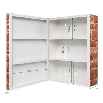Der Medizinschrank ist gesamt 35x46x15cm groß und wiegt ca. 3900g. Der Türanschlag ist links und kann nicht verändert werden, die Fronttür öffnet ca. 115°. Die Folierung befindet sich auf der Front und den Seiten. Das Gehäuse ist zeitlos weiß und aus Stahl gefertigt. Die innenliegenden Fächer haben verschiedene Größen für unterschiedliche Aufbewahrungsmöglichkeiten, in der Innentür können ebenfalls Dinge abgelegt werden. Befestigt wird der Medizinschrank an 4 Stellen auf der Rückseite, Sie erhalten 3 Schlüssel.